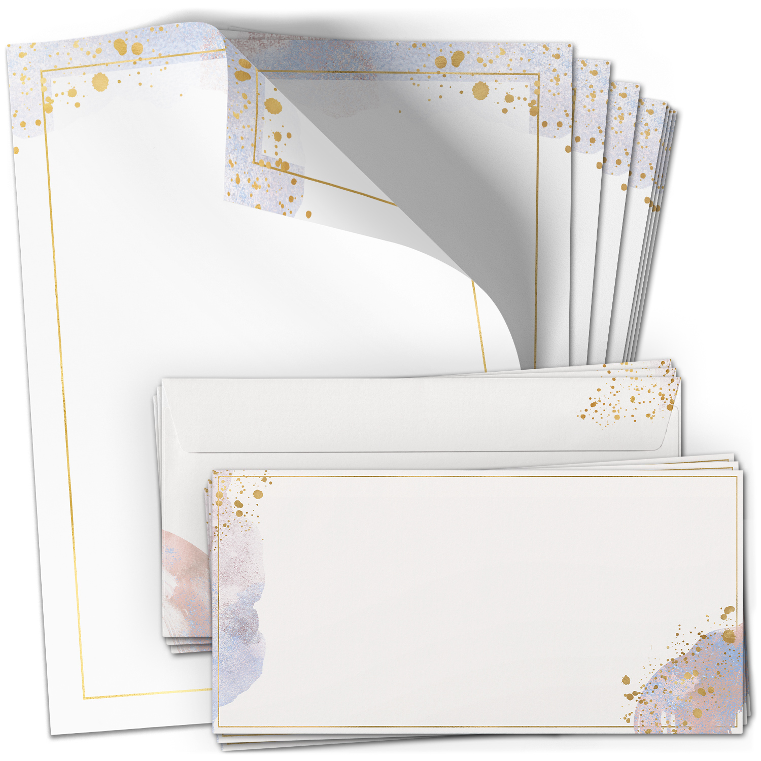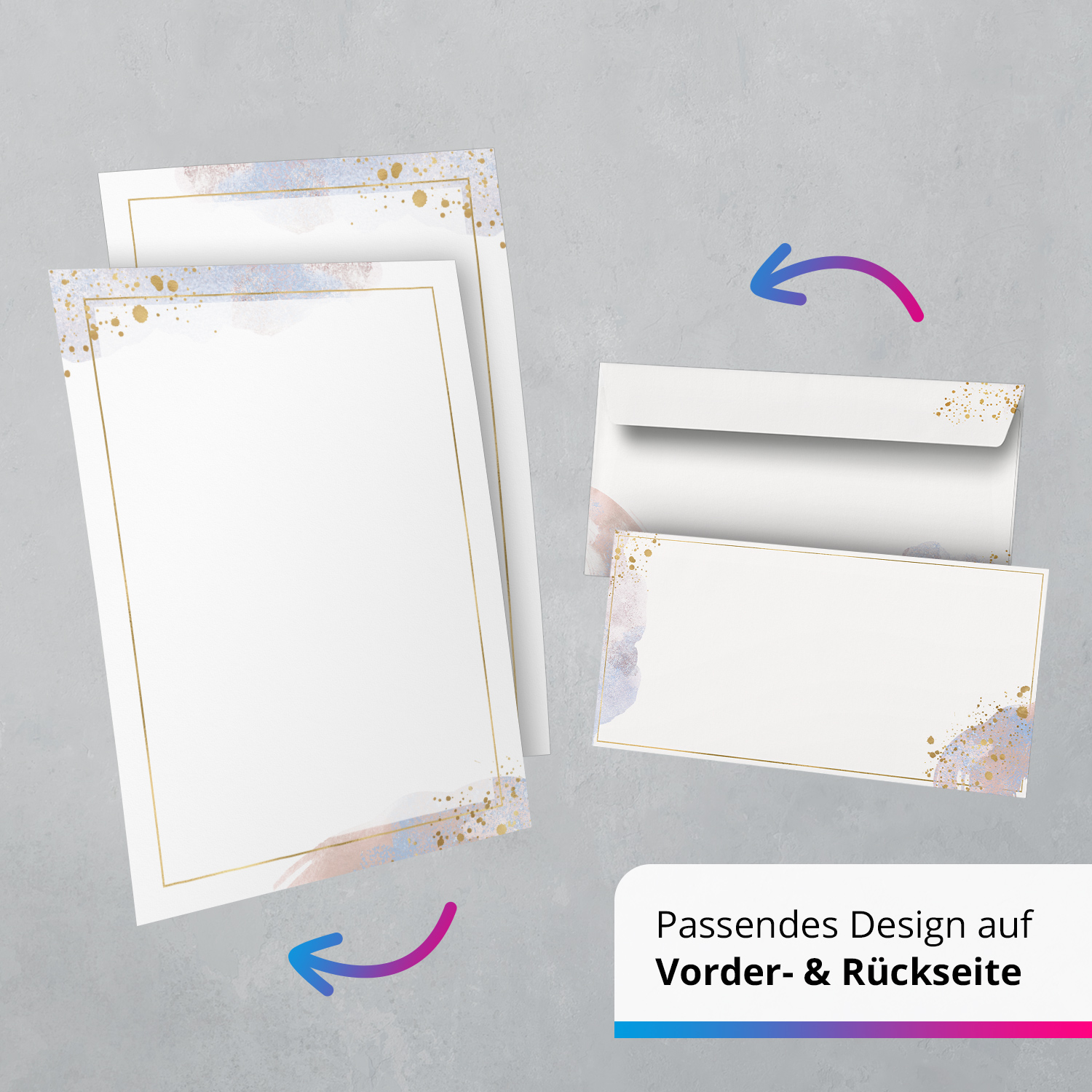 10 Briefpapier und Briefumschlag SET | Aquarell Gold-Look | Papier und Umschlag mit Design-Motiv bedruckt | 90 g/m²