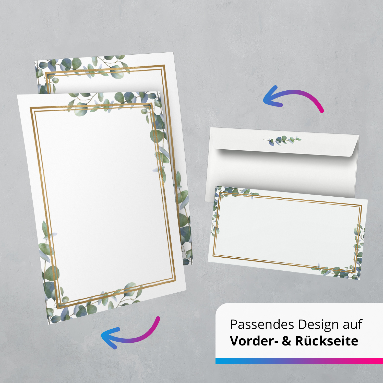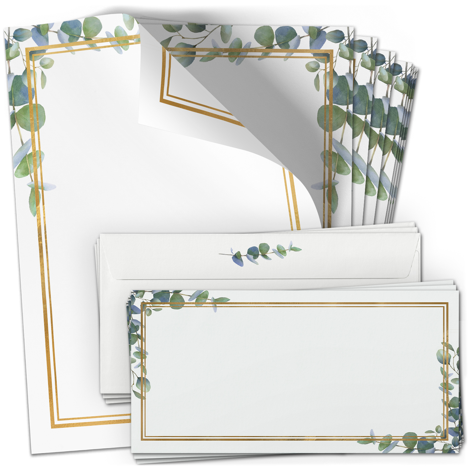 10 Briefpapier und Briefumschlag SET | Eukalyptus Gold-Look | Papier und Umschlag mit Design-Motiv bedruckt | 90 g/m²