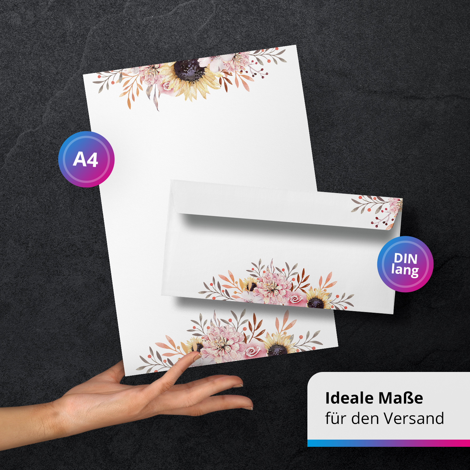 10 Briefpapier und Briefumschlag SET | Sonnenblume Blumen | Papier und Umschlag mit Design-Motiv bedruckt | 90 g/m²