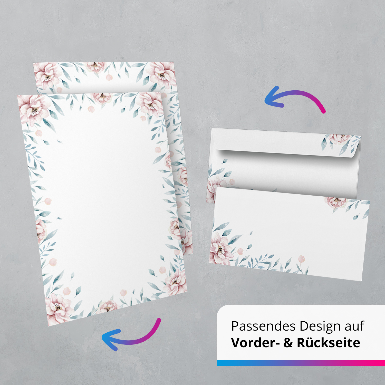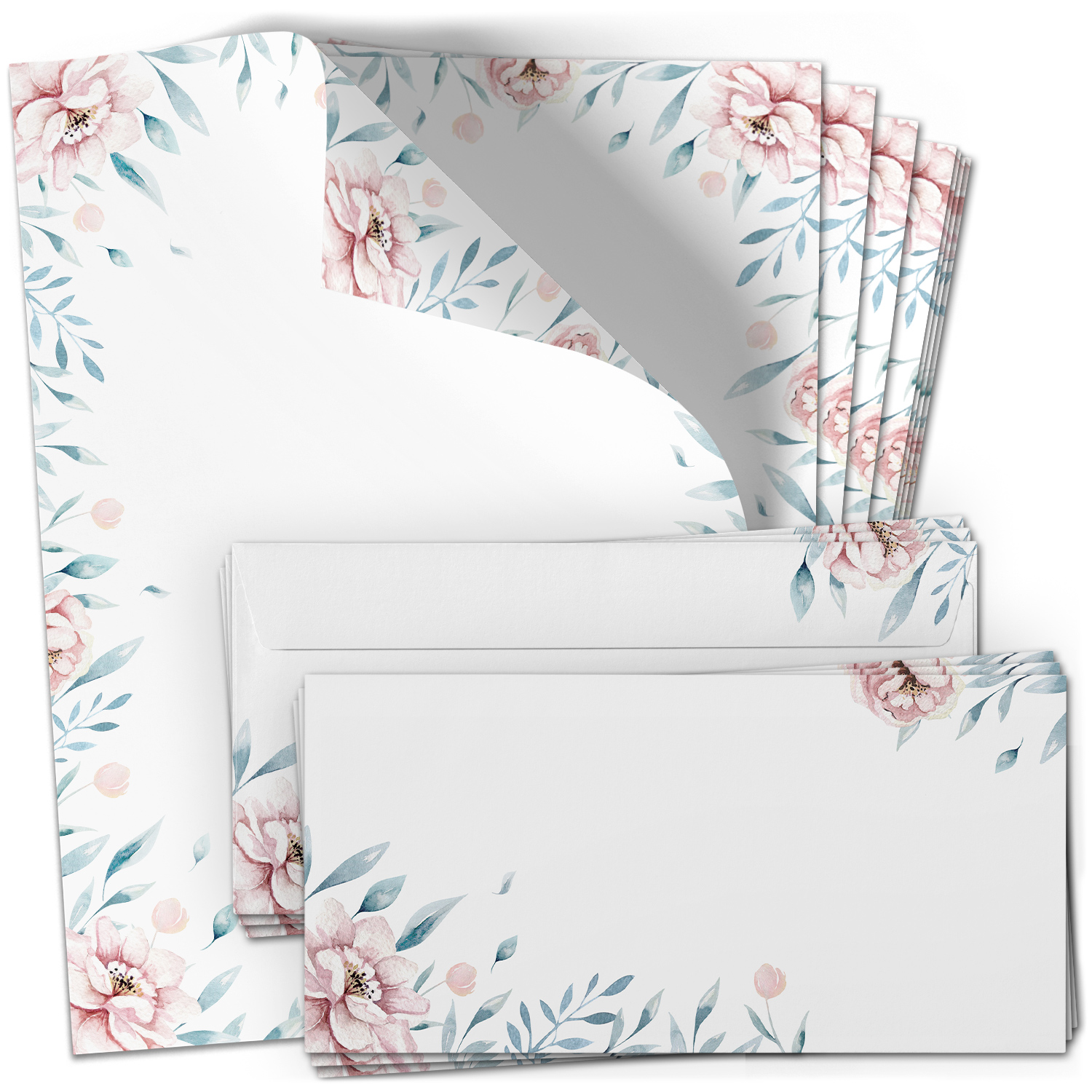 10 Briefpapier und Briefumschlag SET | Wildrose Blumen Romantisch | Papier und Umschlag mit Design-Motiv bedruckt | 90 g/m²