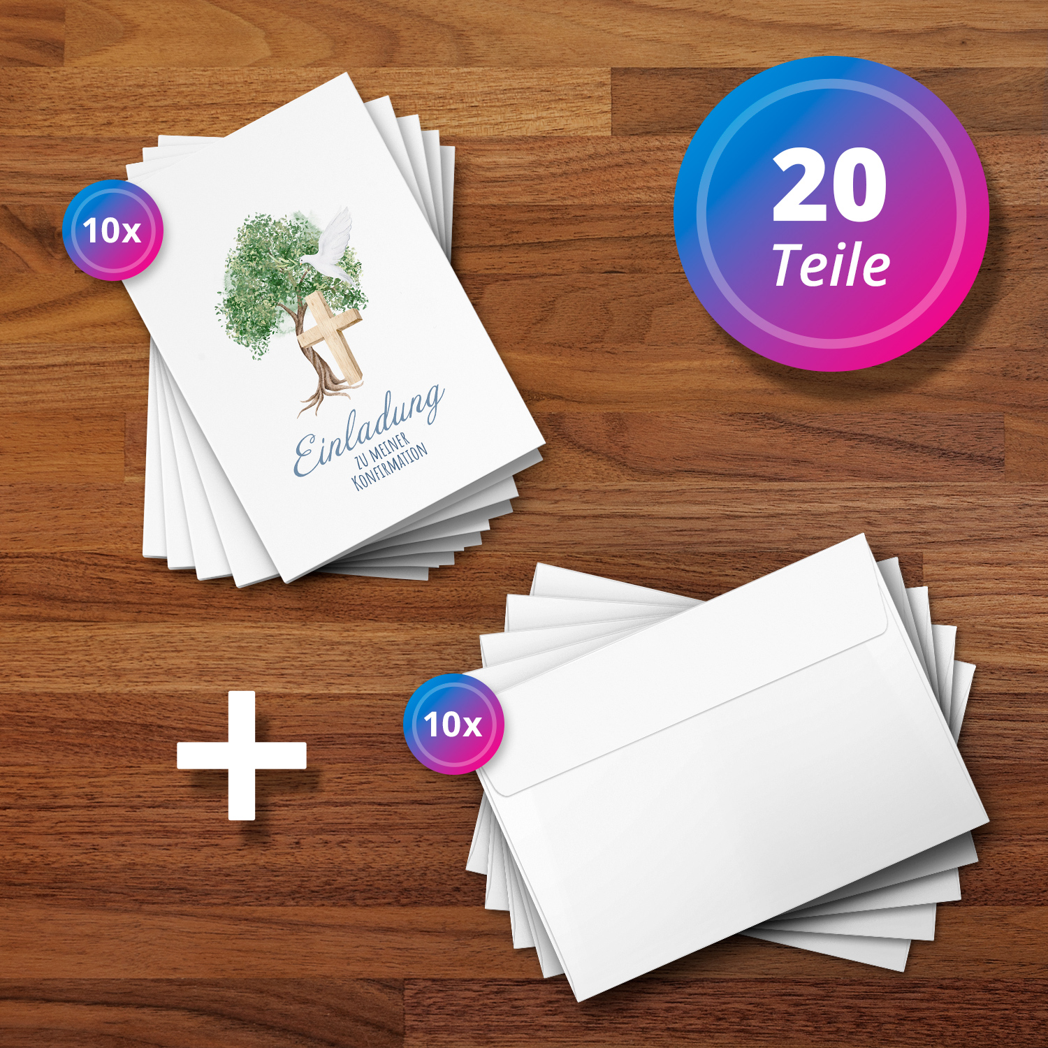 10 Einladungskarten Konfirmation – Motiv Weiße Taube Kreuz – moderne Klappkarten mit Umschlägen – Einladungen zu Konfirmationsfeier Einladung Karten