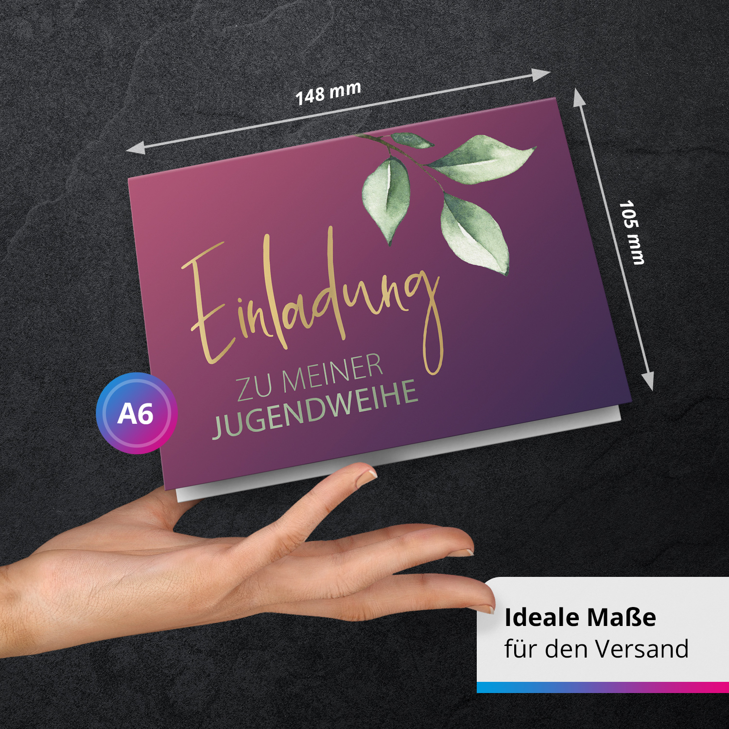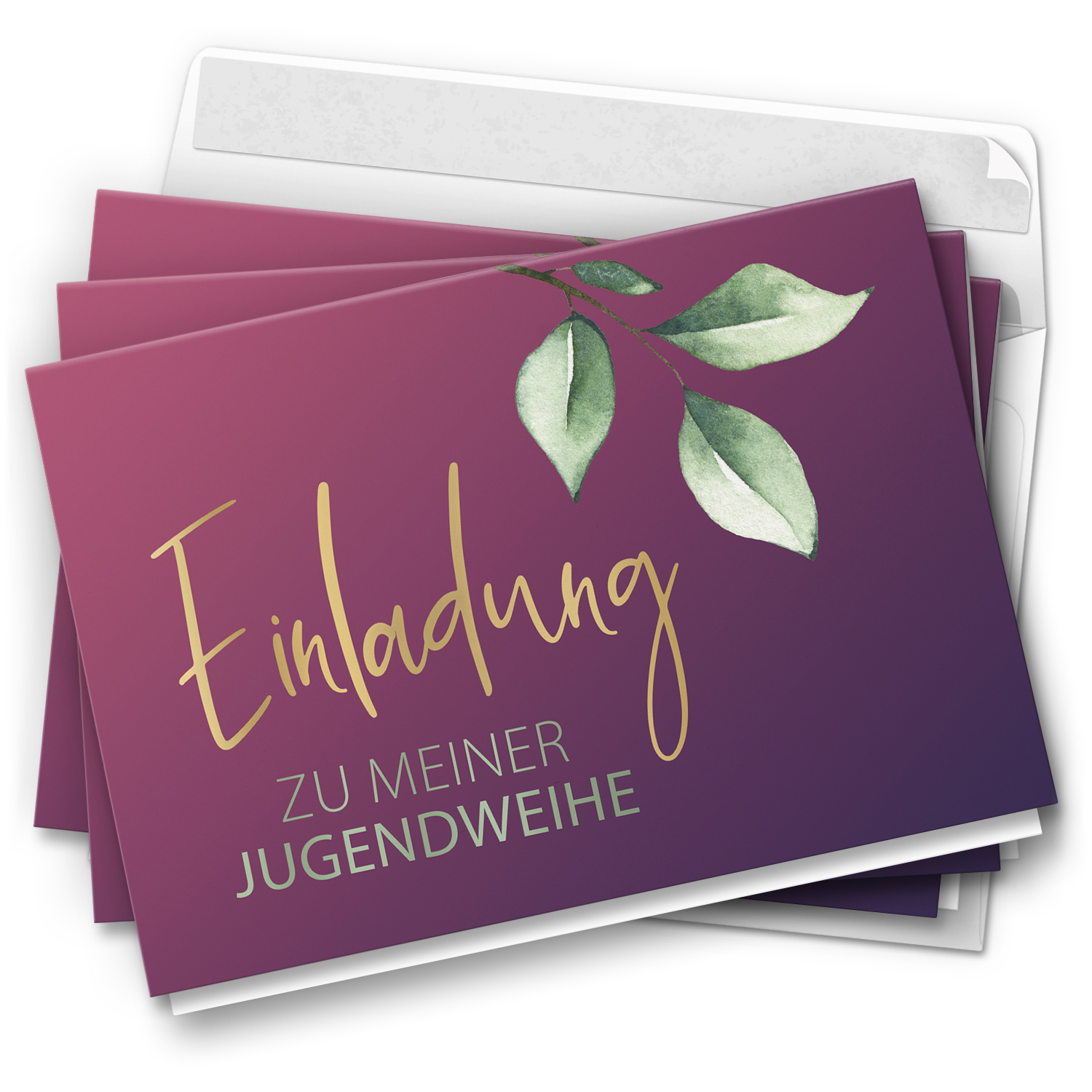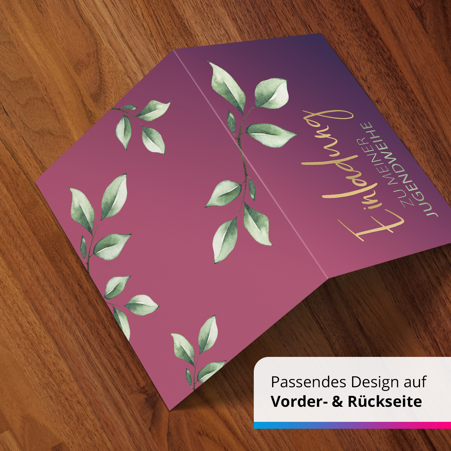 10 Jugendweihe Einladungskarten Mädchen – Motiv Lila Zweige Blätter – moderne Einladungen Klappkarten mit Umschlägen