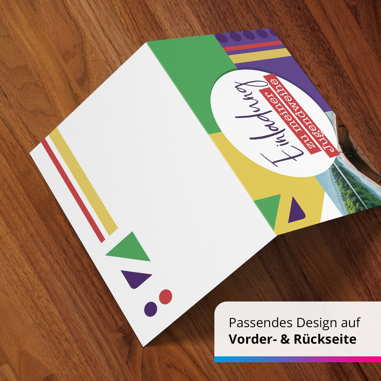 Gedruckt auf hochwertigem Papier wirken die Karten edel und sind angenehm in der Hand. Die Innenseiten sind frei beschreibbar, sodass persönliche Worte, wichtige Informationen und individuelle Gestaltungen problemlos Platz finden.