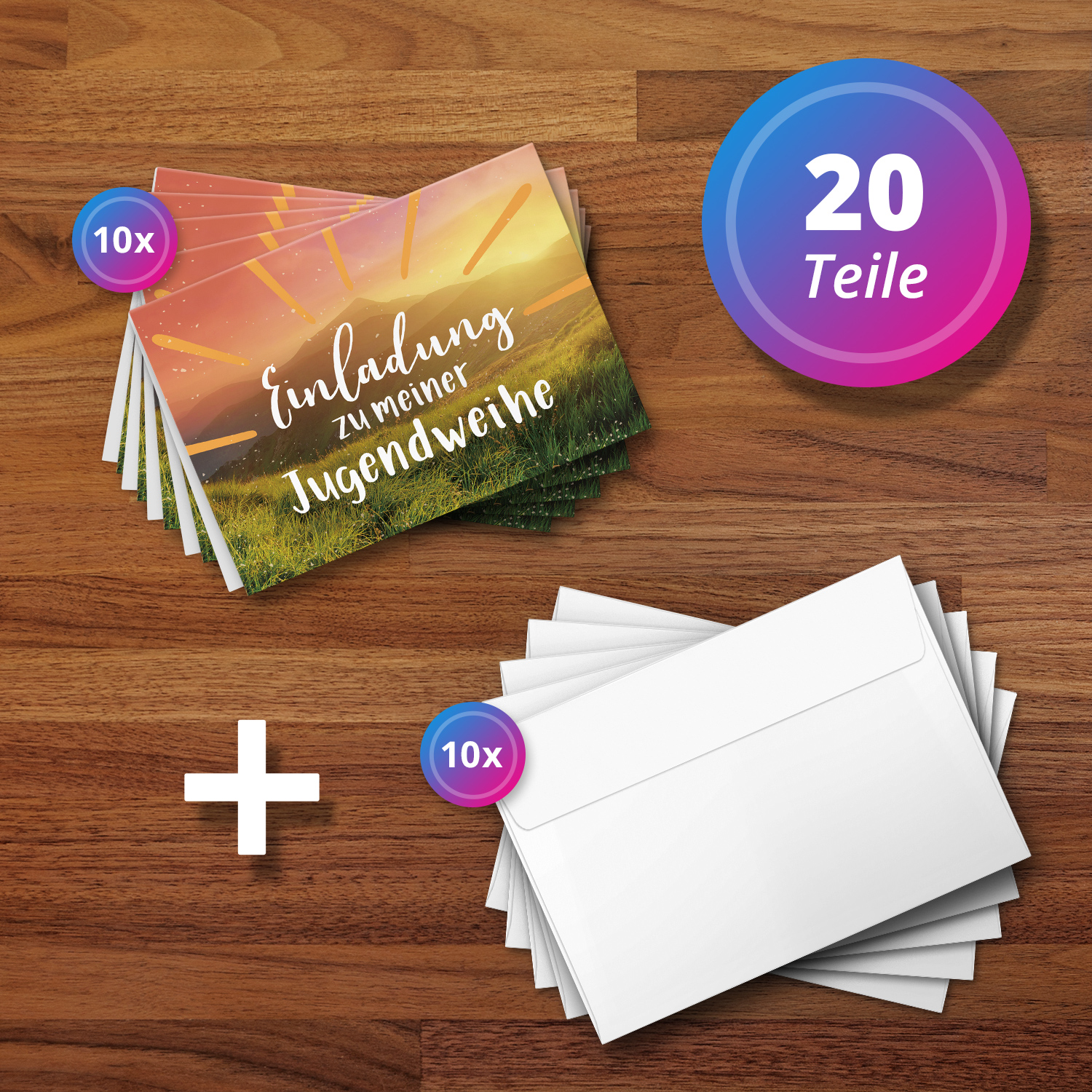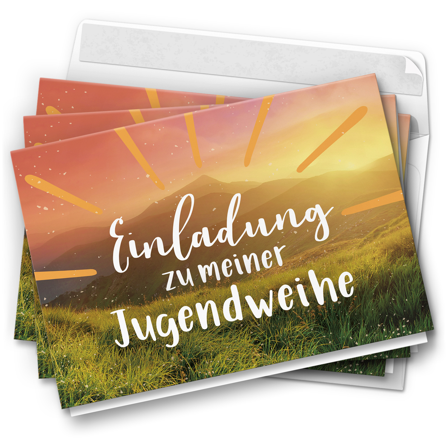 10 Jugendweihe Einladungskarten – Motiv Positiv Blick auf Berge – moderne Einladungen Klappkarten mit Umschlägen