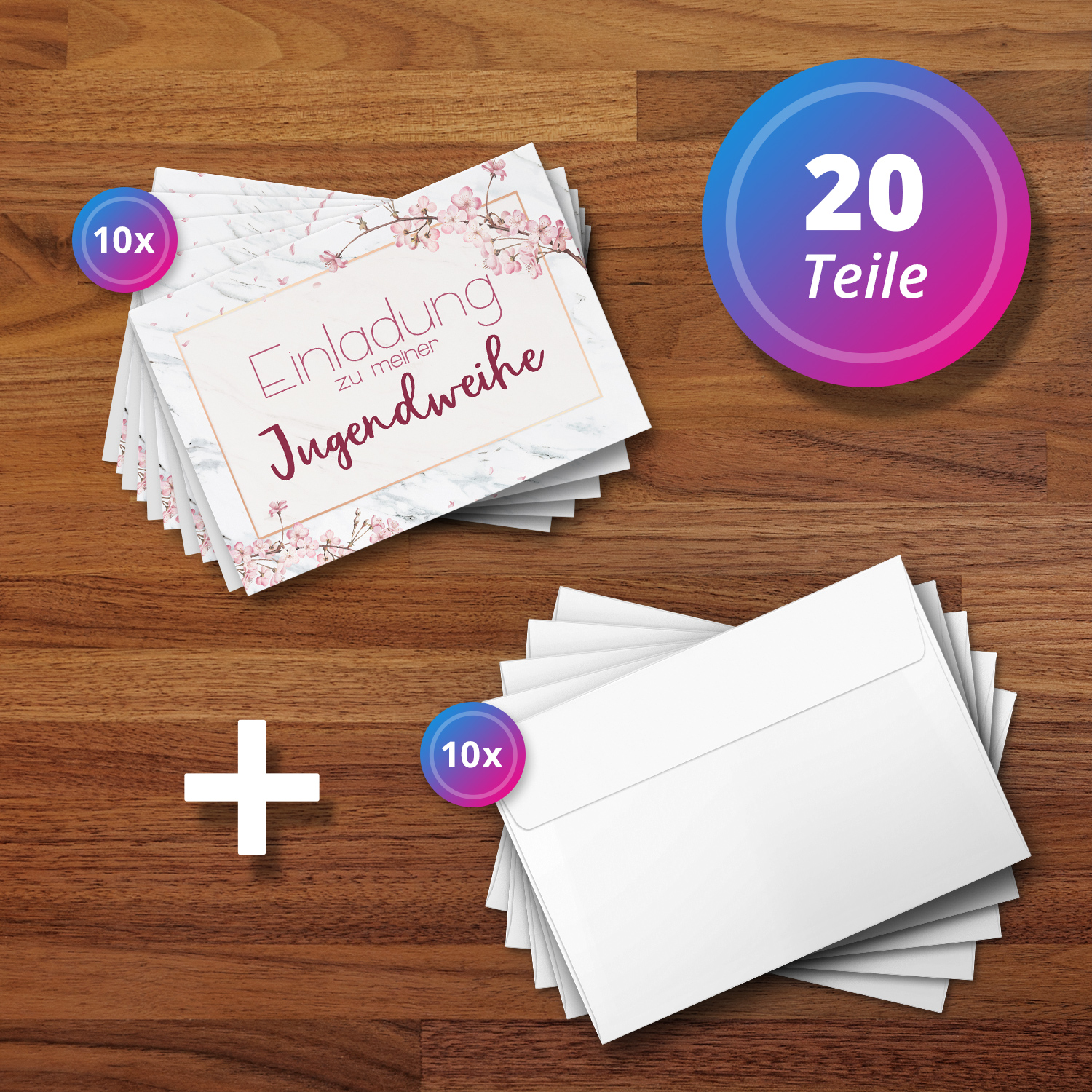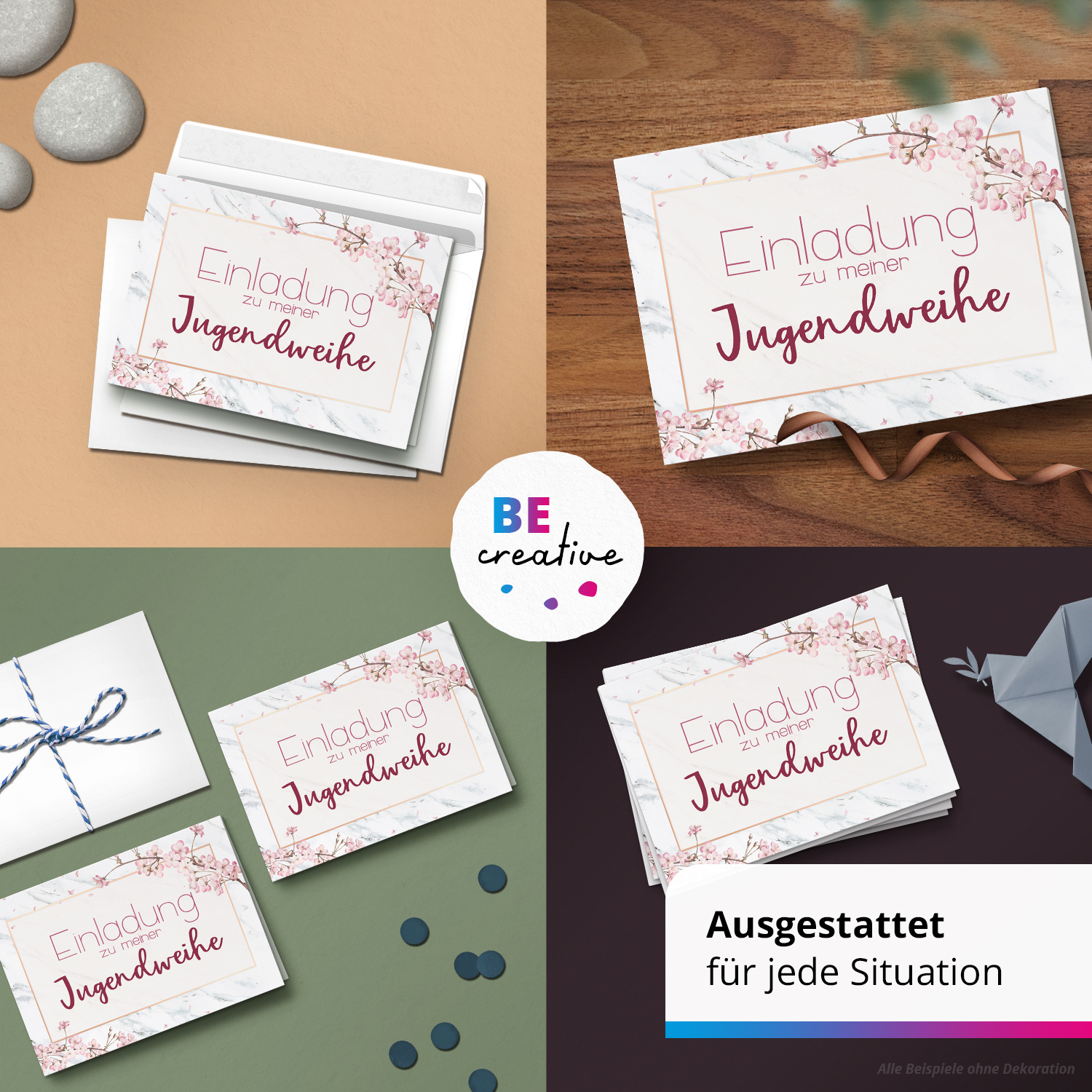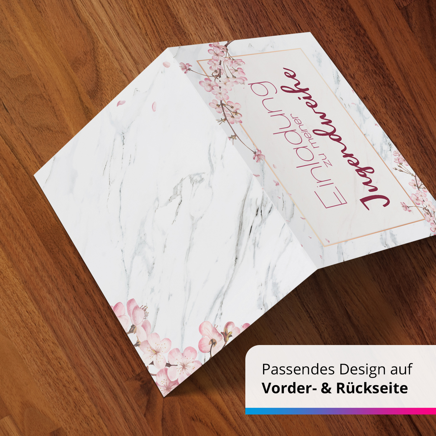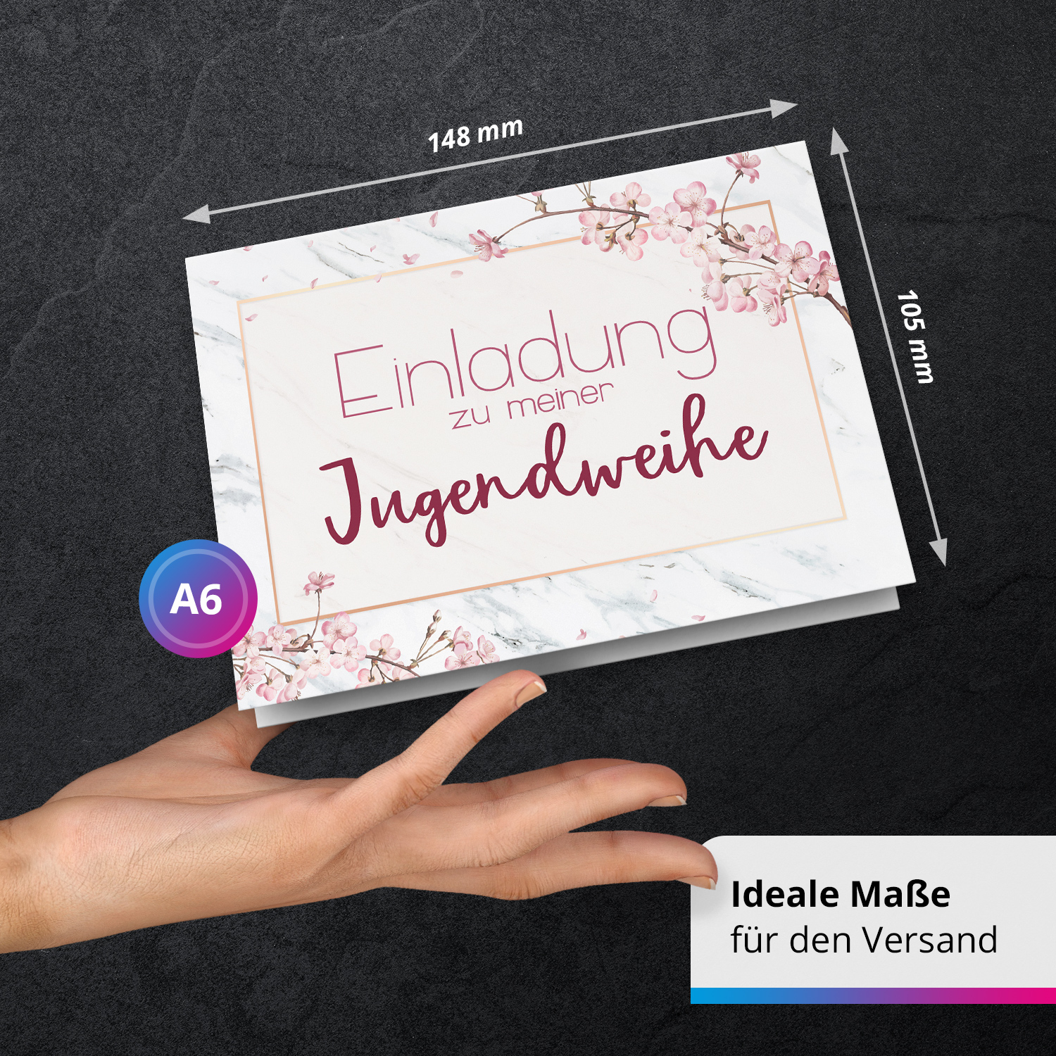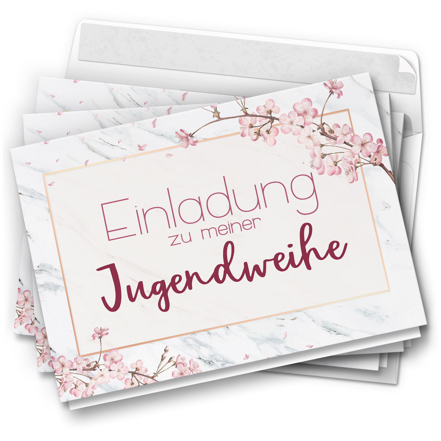 10 moderne Jugendweihe Einladungskarten – Motiv Marmor Kirsche – Design Klappkarten Einladung Karten mit Umschlag