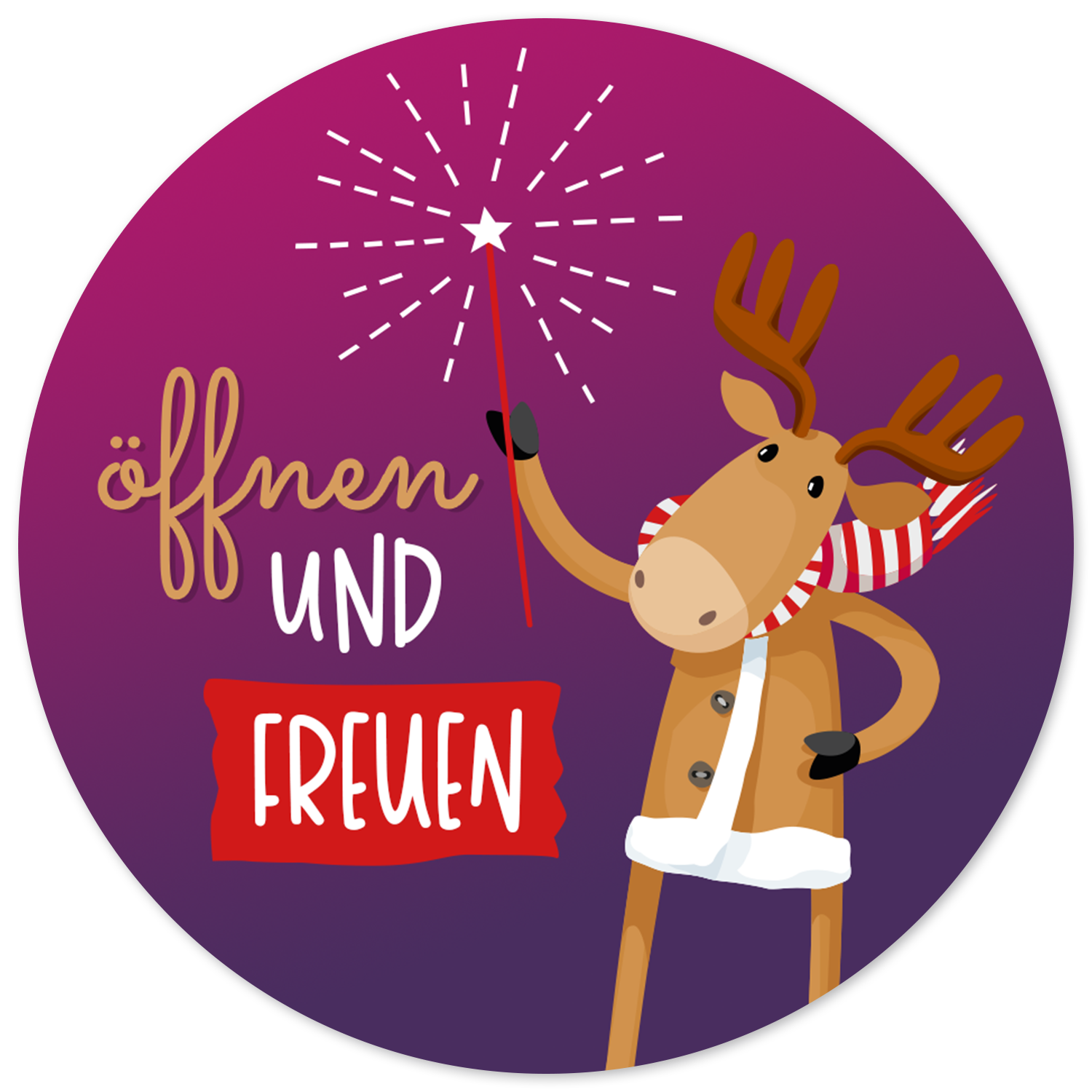 48 Geschenkaufkleber Weihnachten – AUSPACKEN UND FREUEN Rentier lila – Weihnachtsaufkleber Aufkleber für Geschenke Etiketten rund 4cm