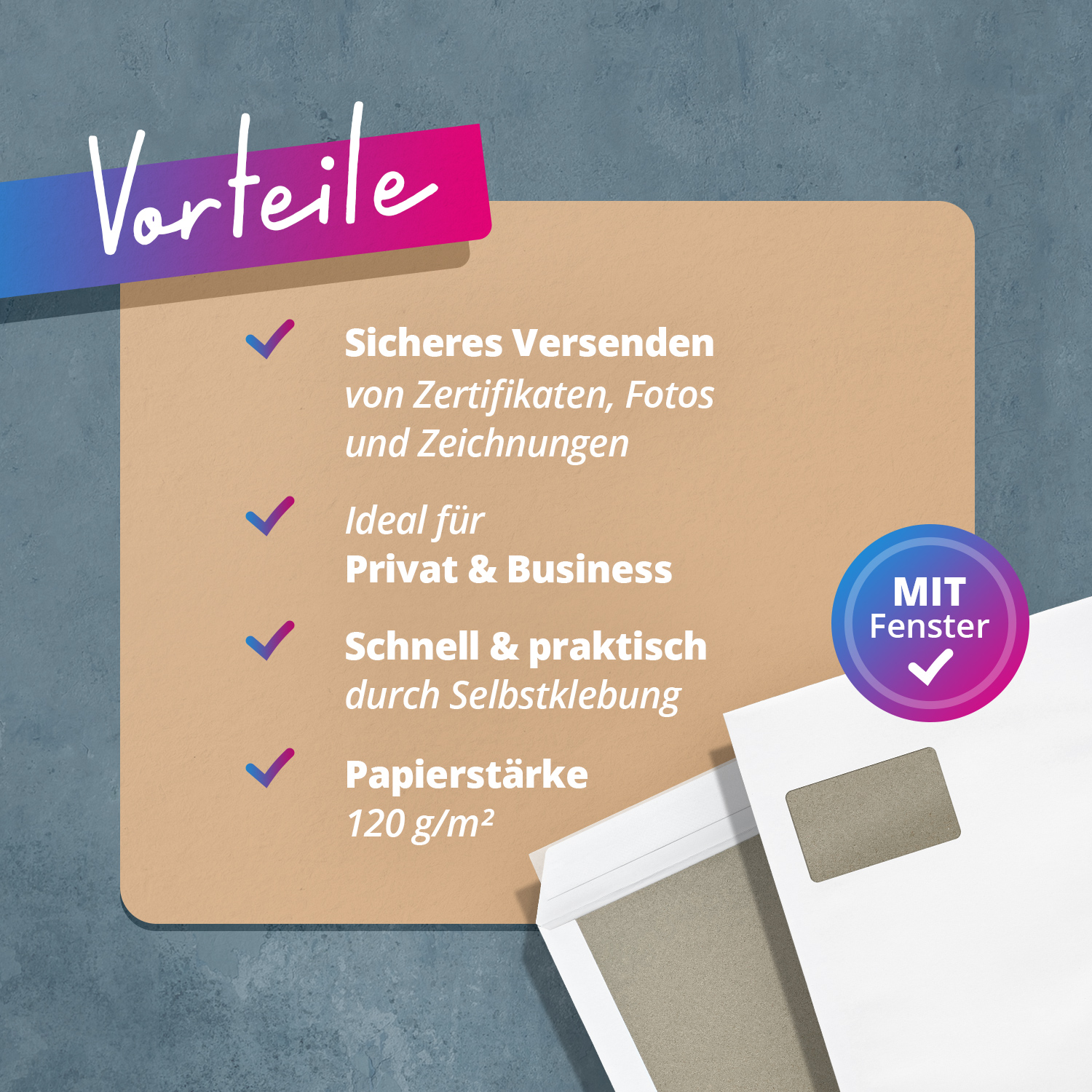 5 x Briefumschläge mit Fenster DIN C4 mit Papprückwand (229 x 320 mm), gerade Klappe, selbstklebend, weiß, 120 g/qm Bewerbung