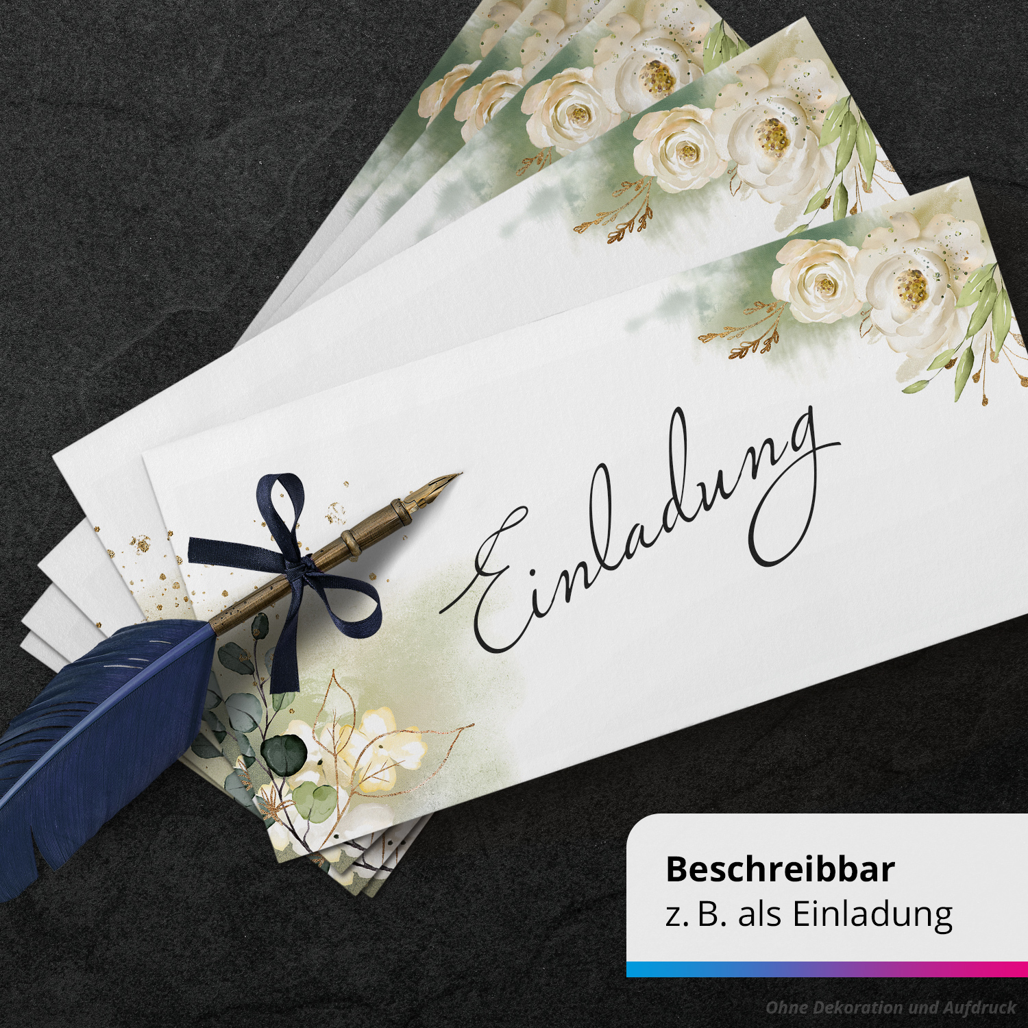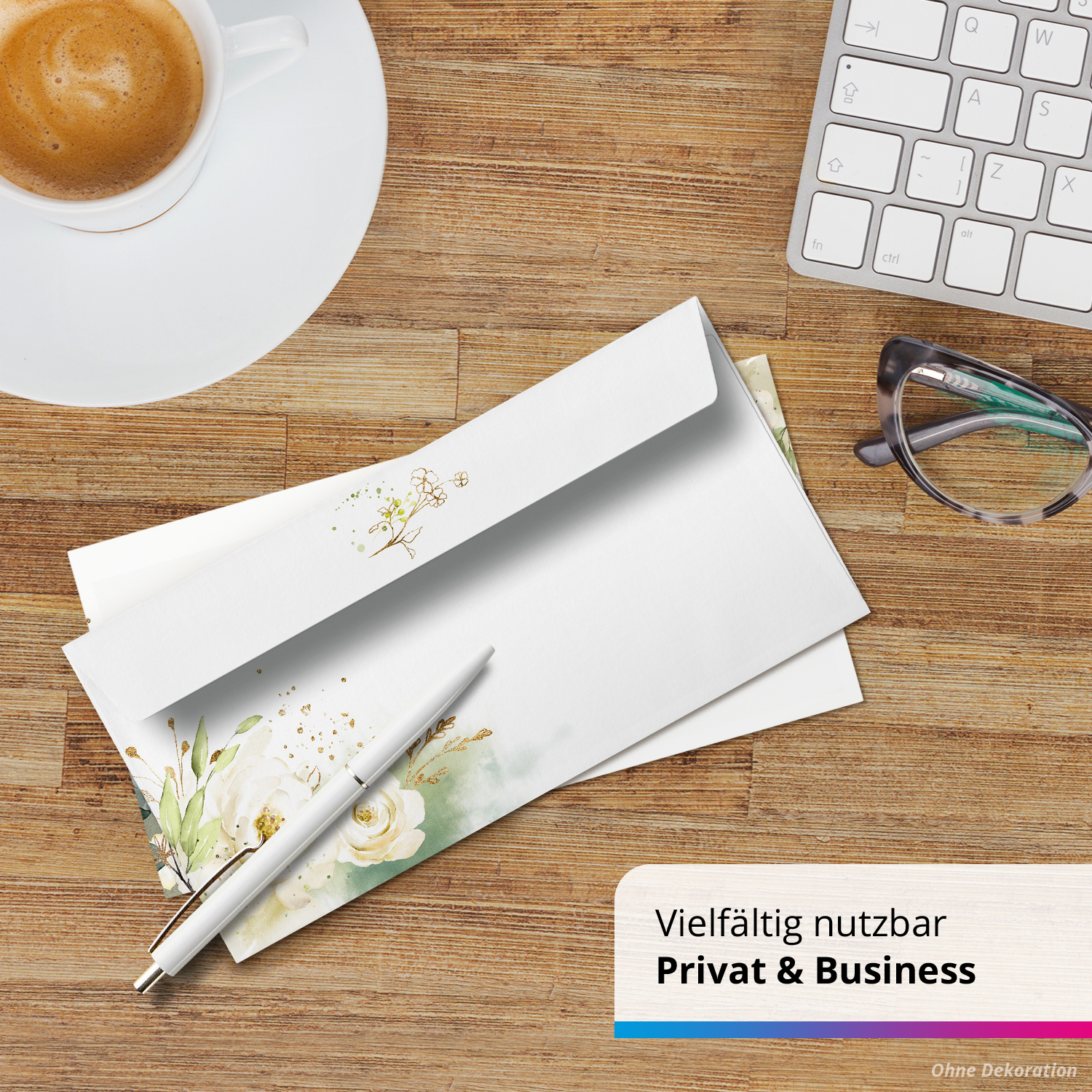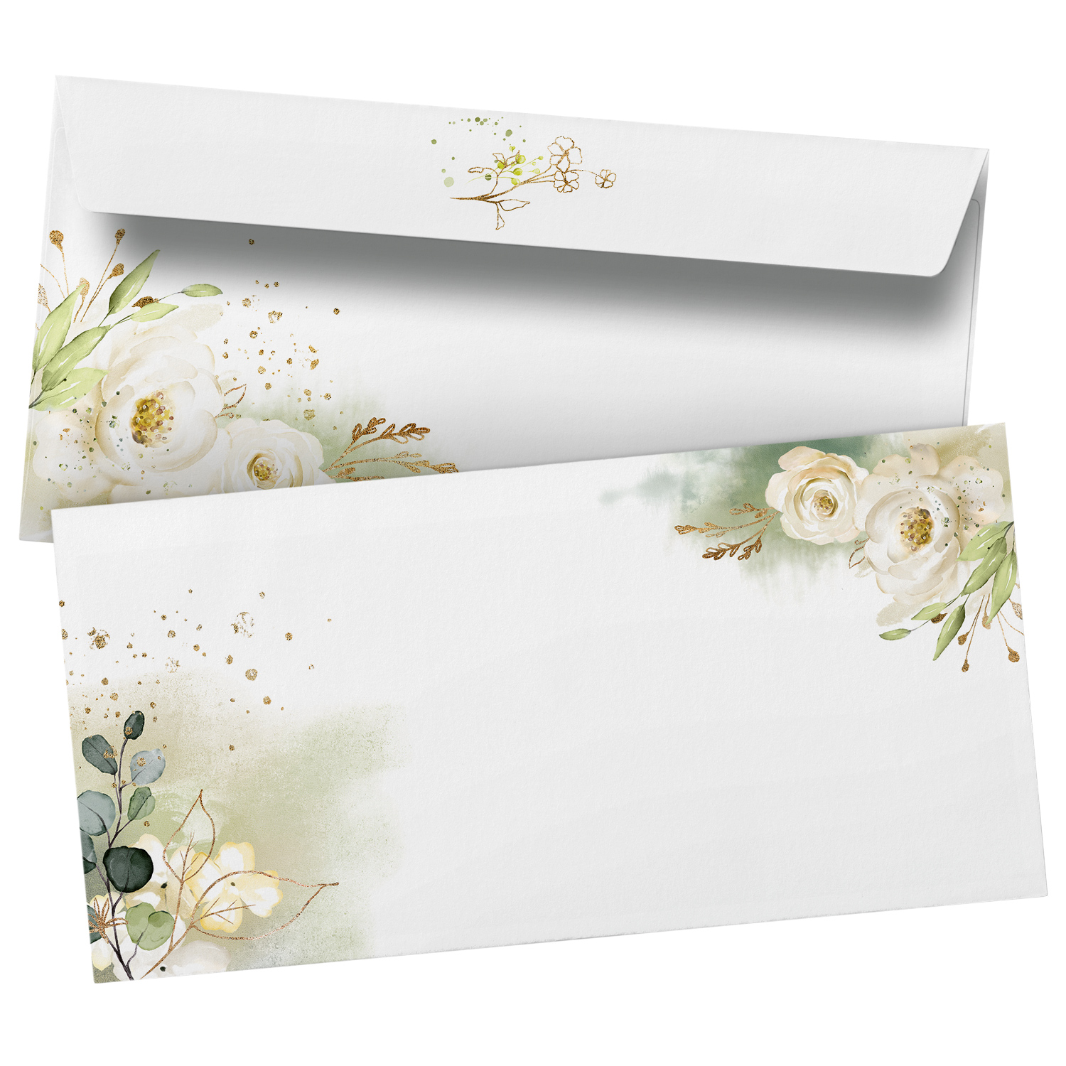 50 Briefumschläge DIN Lang | White Roses Weiße Rosen Romantisch | selbstklebend ohne Fenster | Brief-Umschlag mit Design-Motiv bedruckt | 90 g/m²