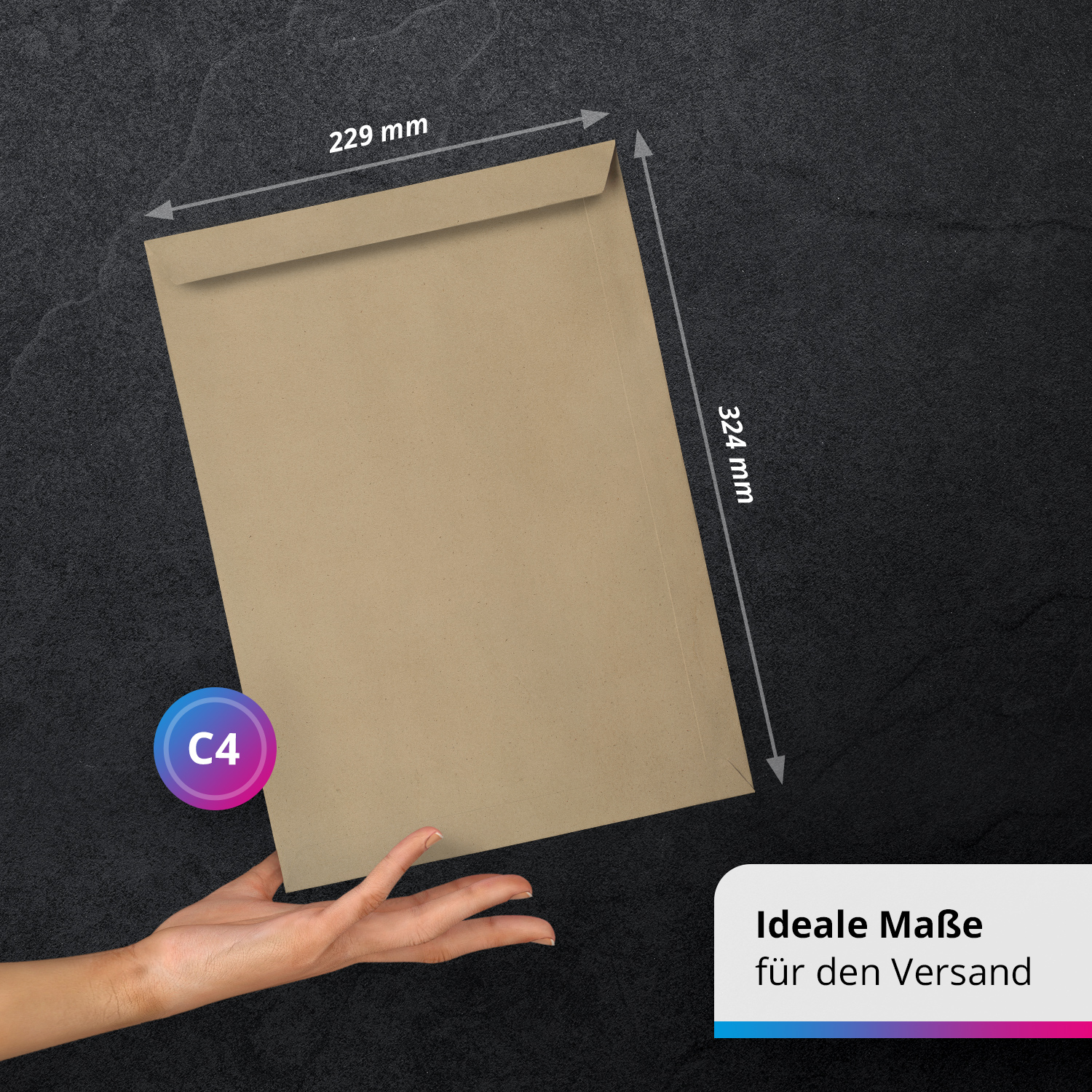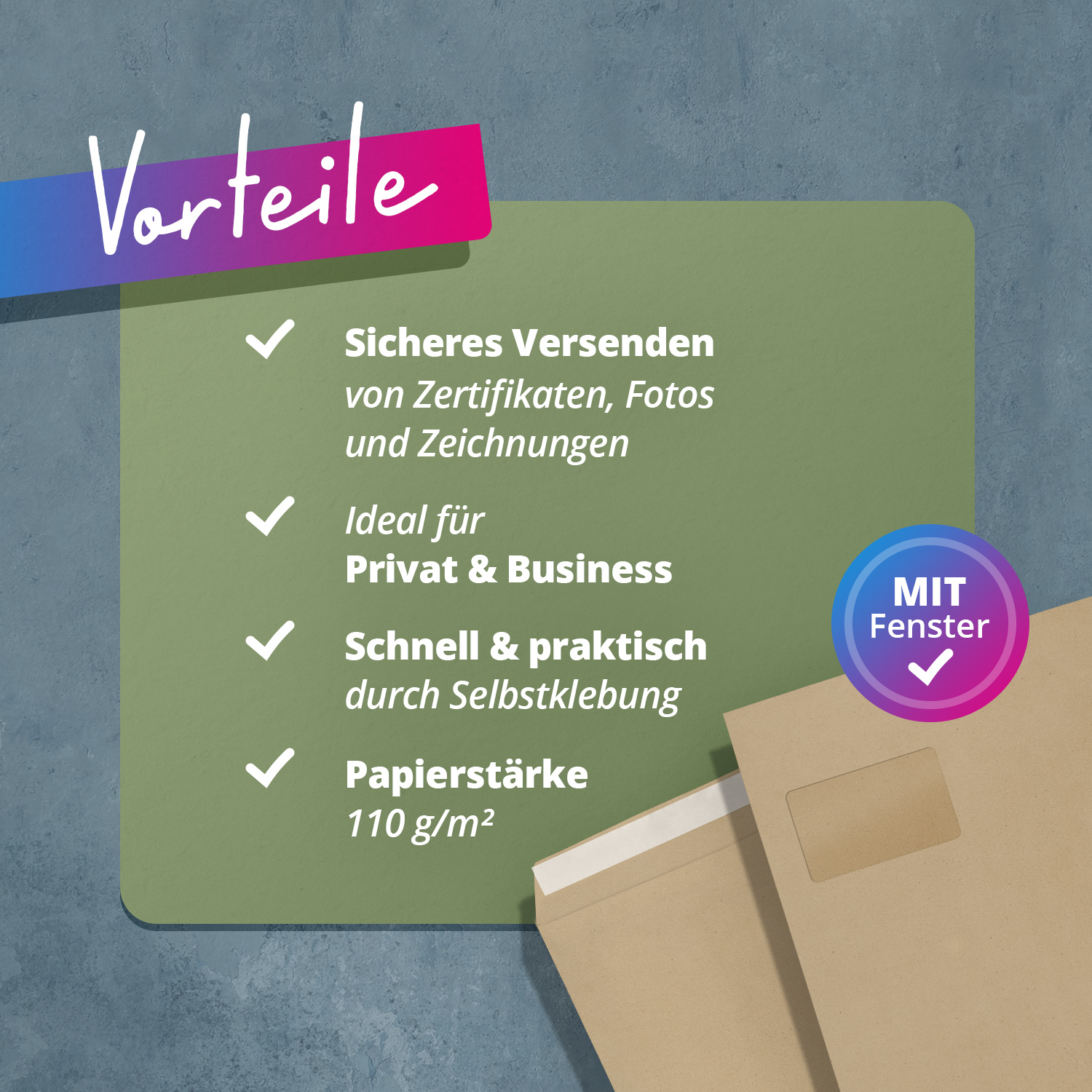 50 x Briefumschläge MIT Fenster DIN C4 für A4 (229 x 320 mm), gerade Klappe, selbstklebend, braun, 110 g/qm Bewerbung und Dokumente