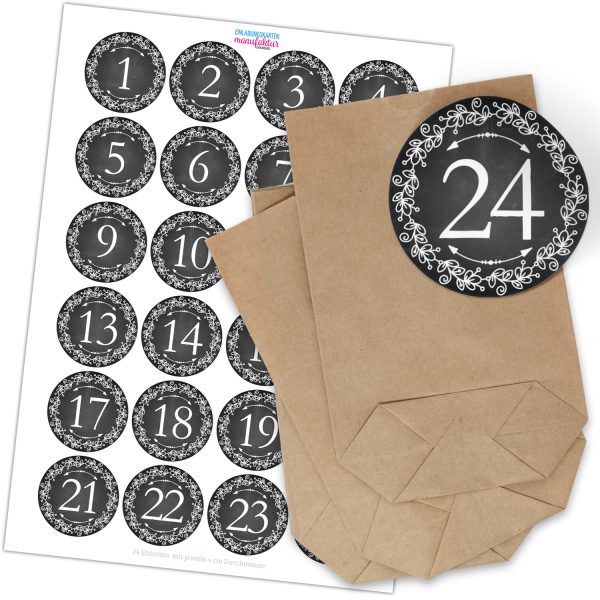 • Inhalt: 24 Zahlen Etiketten + 24 Kraftpapier Beutel