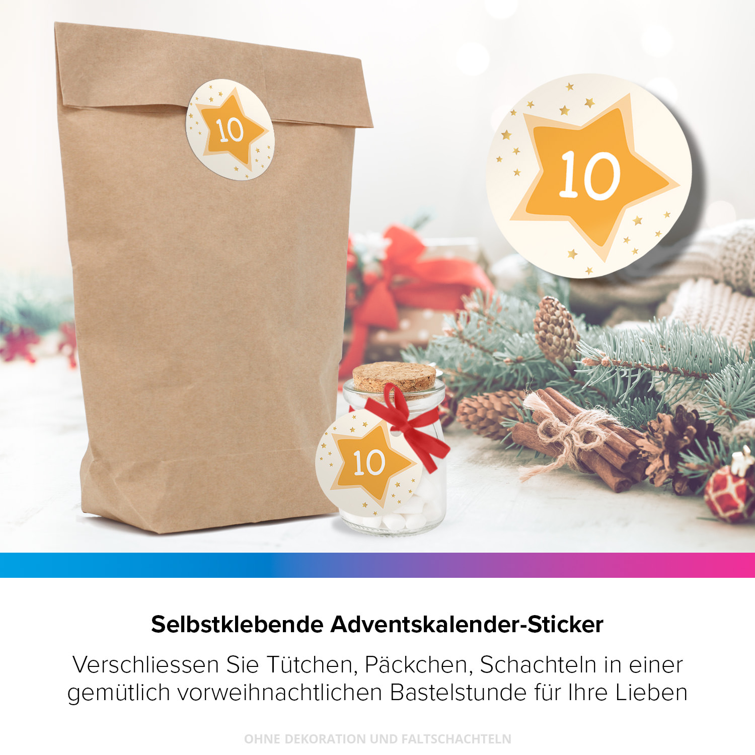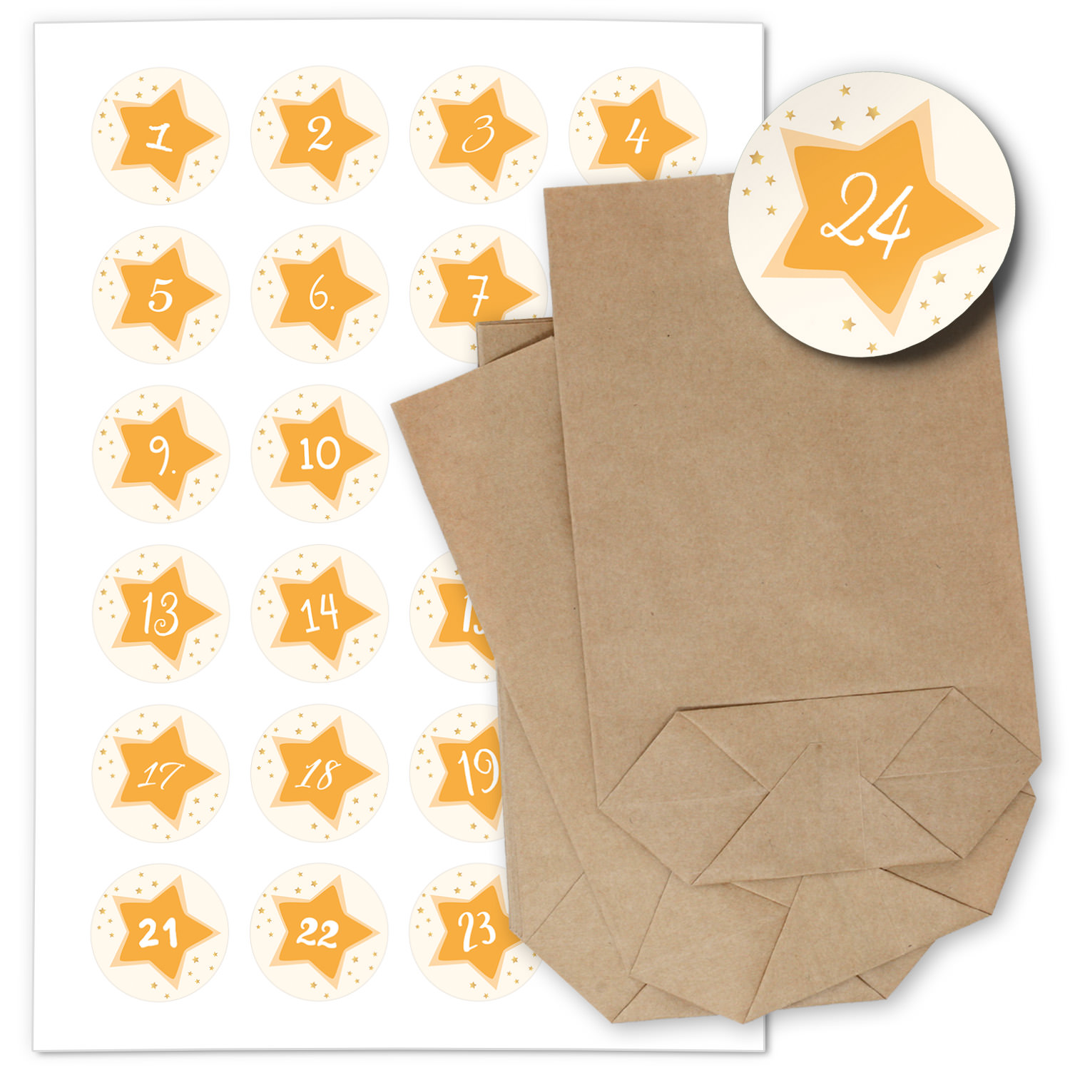 ADVENTSKALENDER SET zum Befüllen – Gelber Stern – mit 24 Tüten und passenden weihnachtlichen Zahlen Aufklebern für Weihnachten, Advent