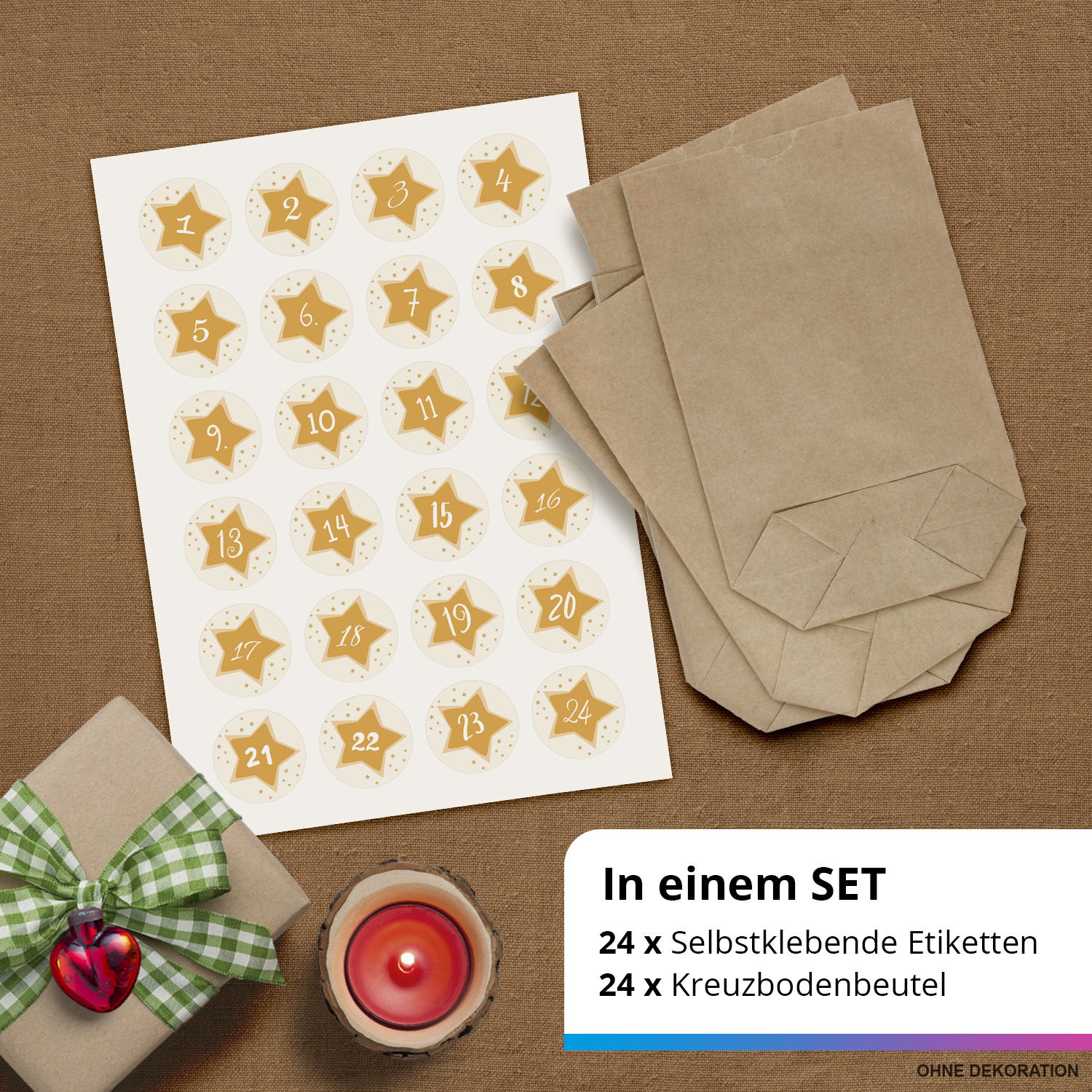 Adventskalender Set – 24 Etiketten & 24 Kraftpapier Beutel für kreative DIY-Ideen