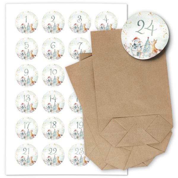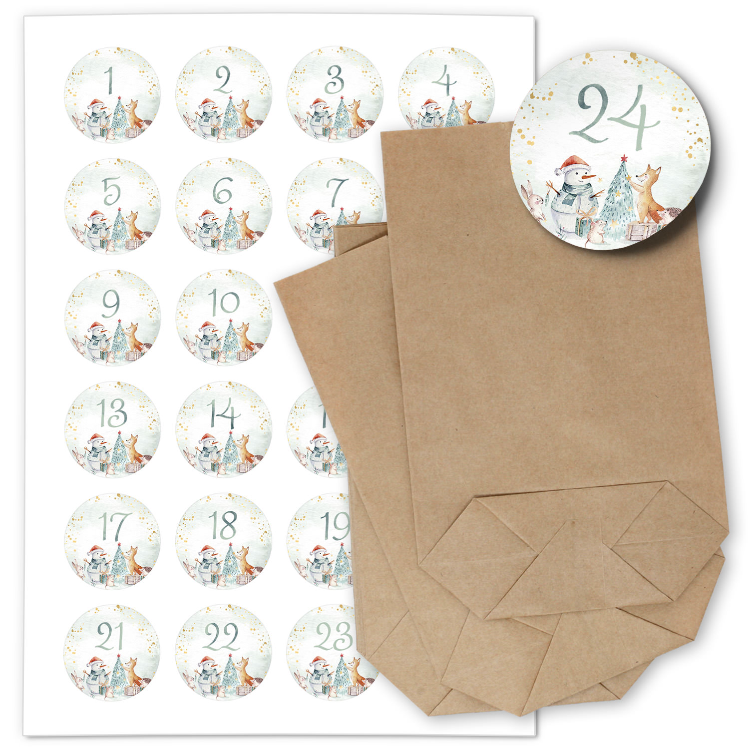 Adventskalender Set – 24 Etiketten & 24 Kraftpapier Beutel für kreative DIY-Ideen