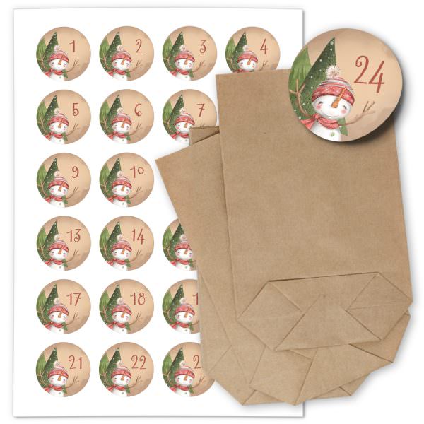 ADVENTSKALENDER SET zum Befüllen – Niedlicher Schneemann – mit 24 Tüten und passenden weihnachtlichen Zahlen Aufklebern für Weihnachten, Advent