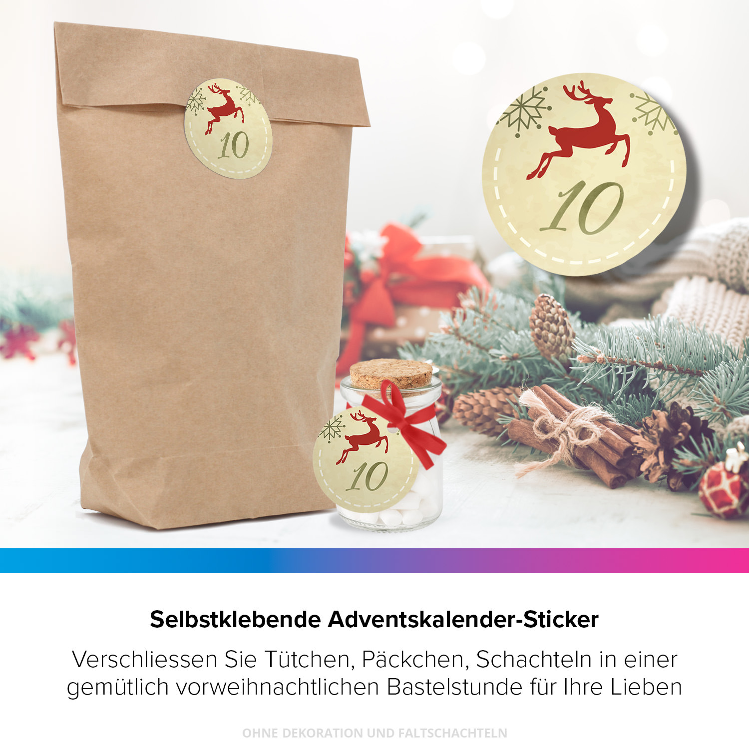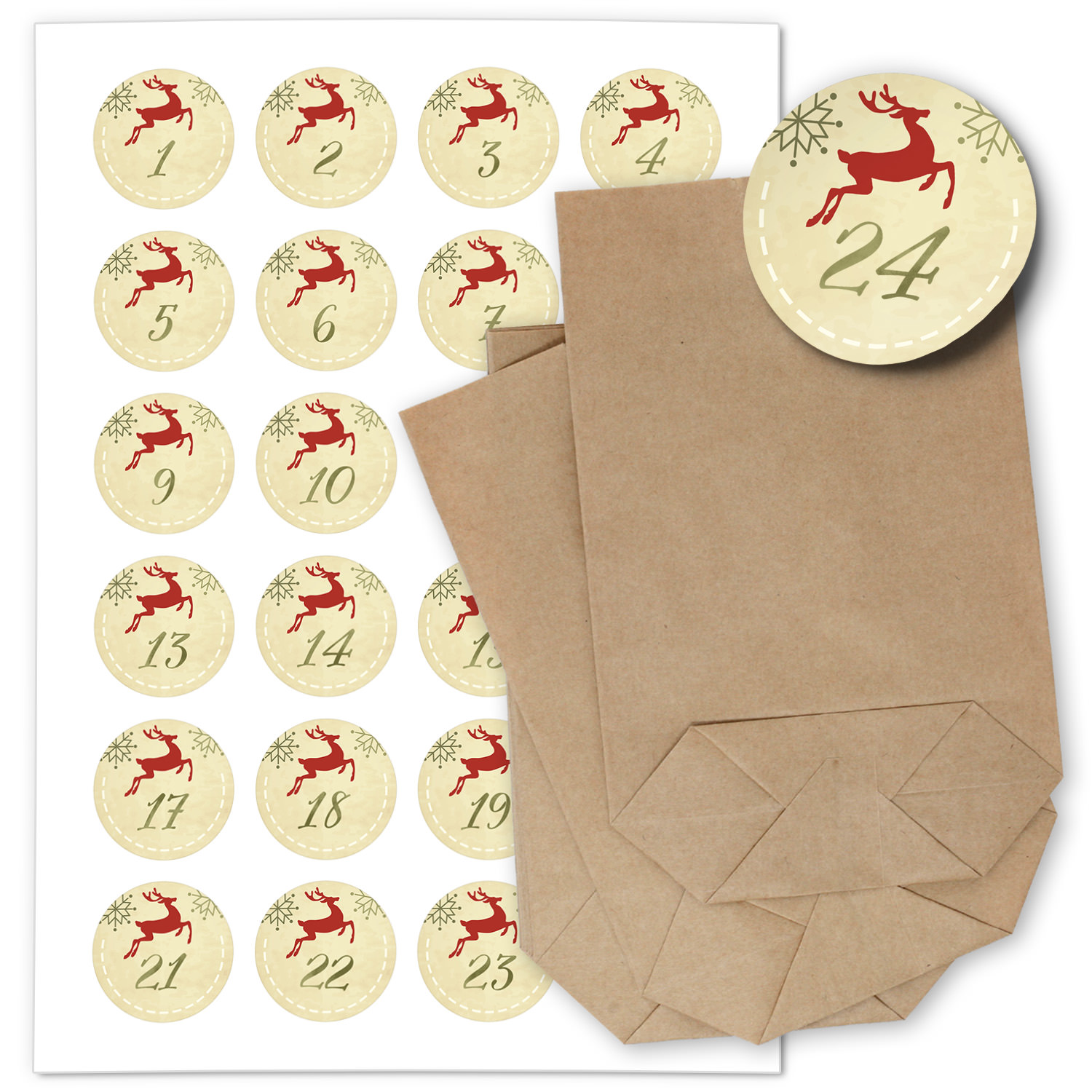 ADVENTSKALENDER SET zum Befüllen – Rentier Rot – mit 24 Tüten und passenden weihnachtlichen Zahlen Aufklebern für Weihnachten, Advent