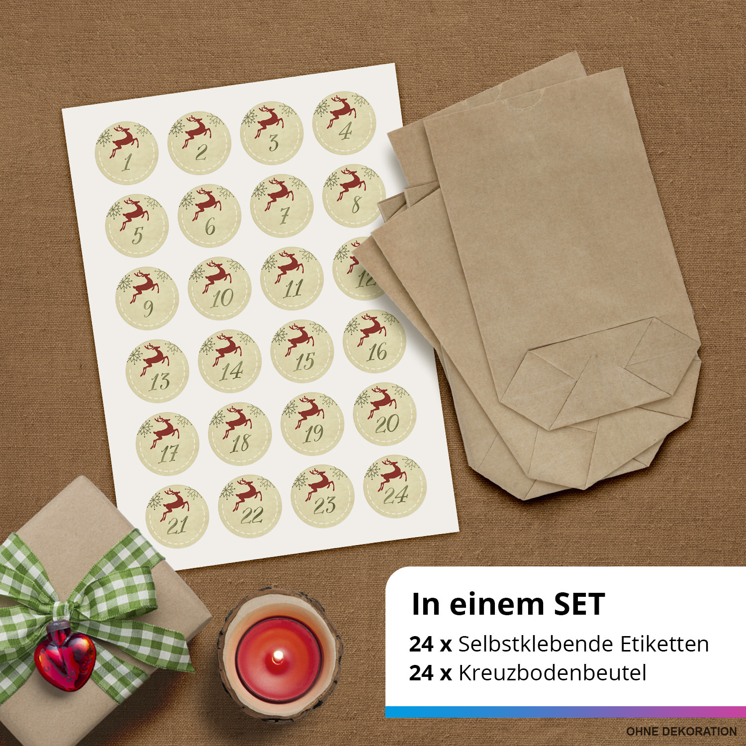 Adventskalender Set – 24 Etiketten & 24 Kraftpapier Beutel für kreative DIY-Ideen