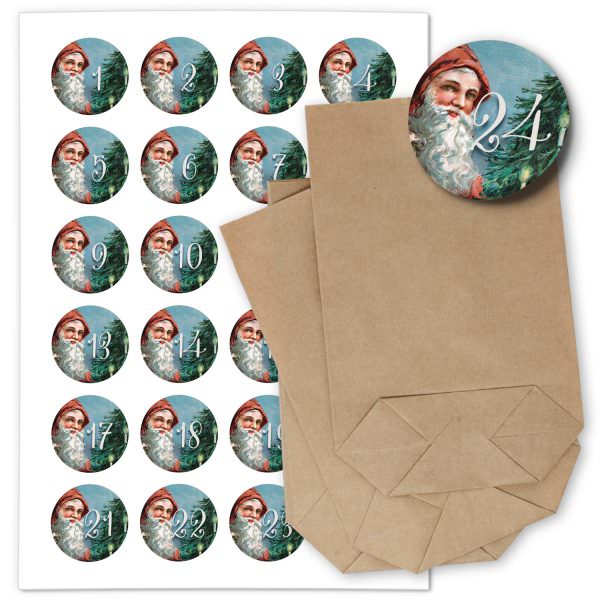 ADVENTSKALENDER SET zum Befüllen – Retro Look Weihnachtsmann – mit 24 Tüten und passenden weihnachtlichen Zahlen Aufklebern für Weihnachten, Advent