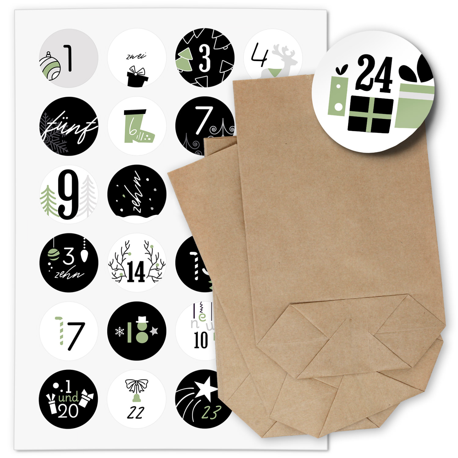 • Inhalt: 24 Zahlen Etiketten + 24 Kraftpapier Beutel