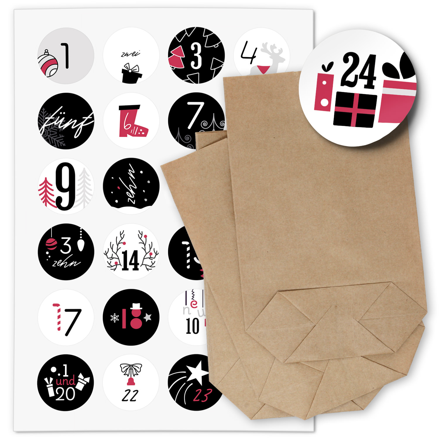 ADVENTSKALENDER SET zum Befüllen – Schwarz Rot Modern – mit 24 Tüten und passenden weihnachtlichen Zahlen Aufklebern für Weihnachten, Advent