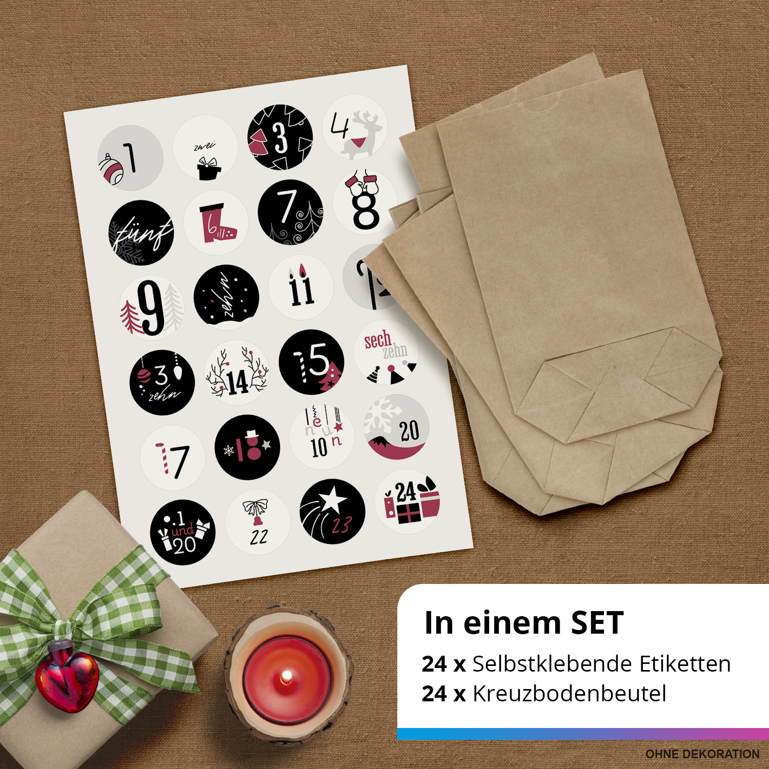 Adventskalender Set – 24 Etiketten & 24 Kraftpapier Beutel für kreative DIY-Ideen
