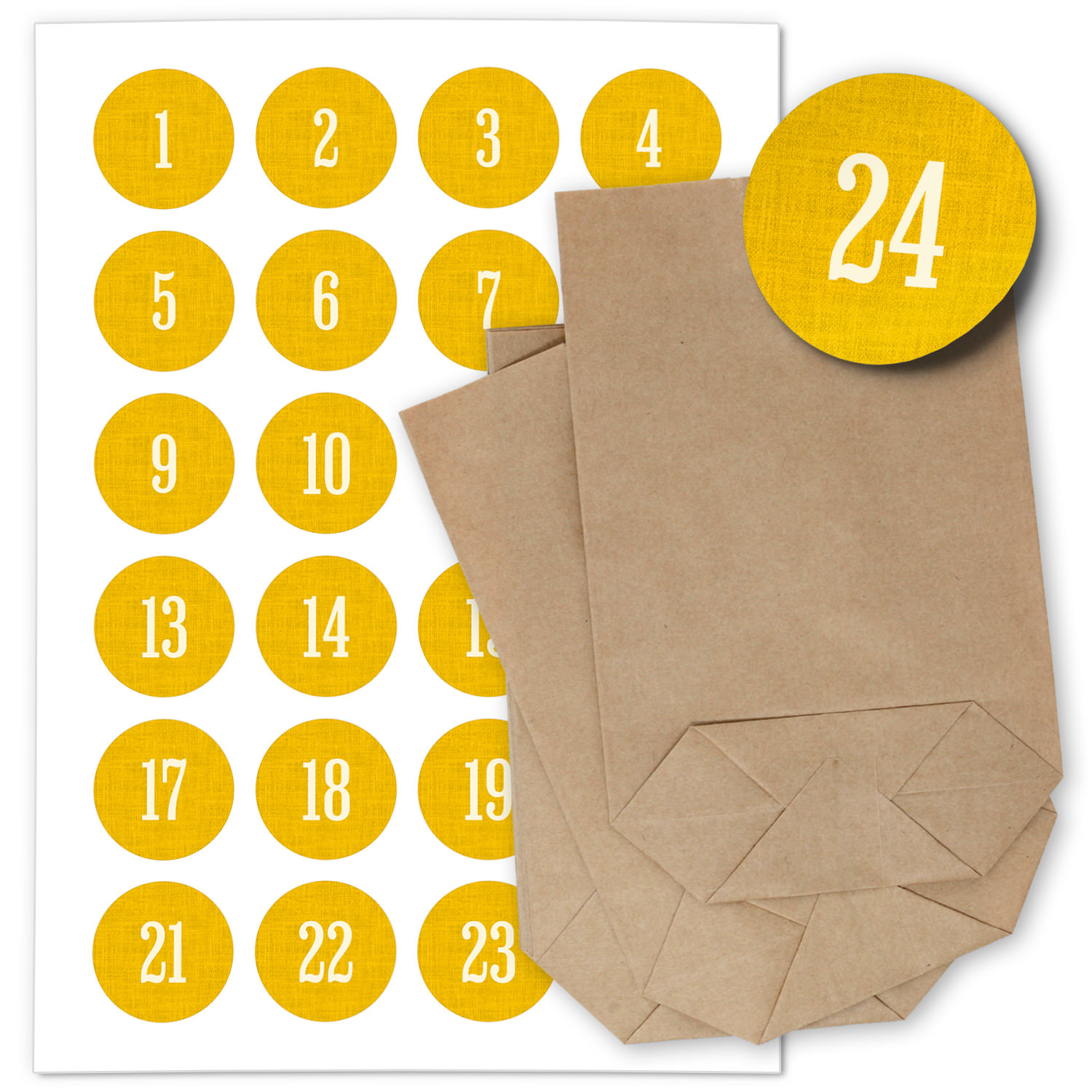 ADVENTSKALENDER SET zum Befüllen – Zahl auf Gelb – mit 24 Tüten und passenden weihnachtlichen Zahlen Aufklebern für Weihnachten, Advent