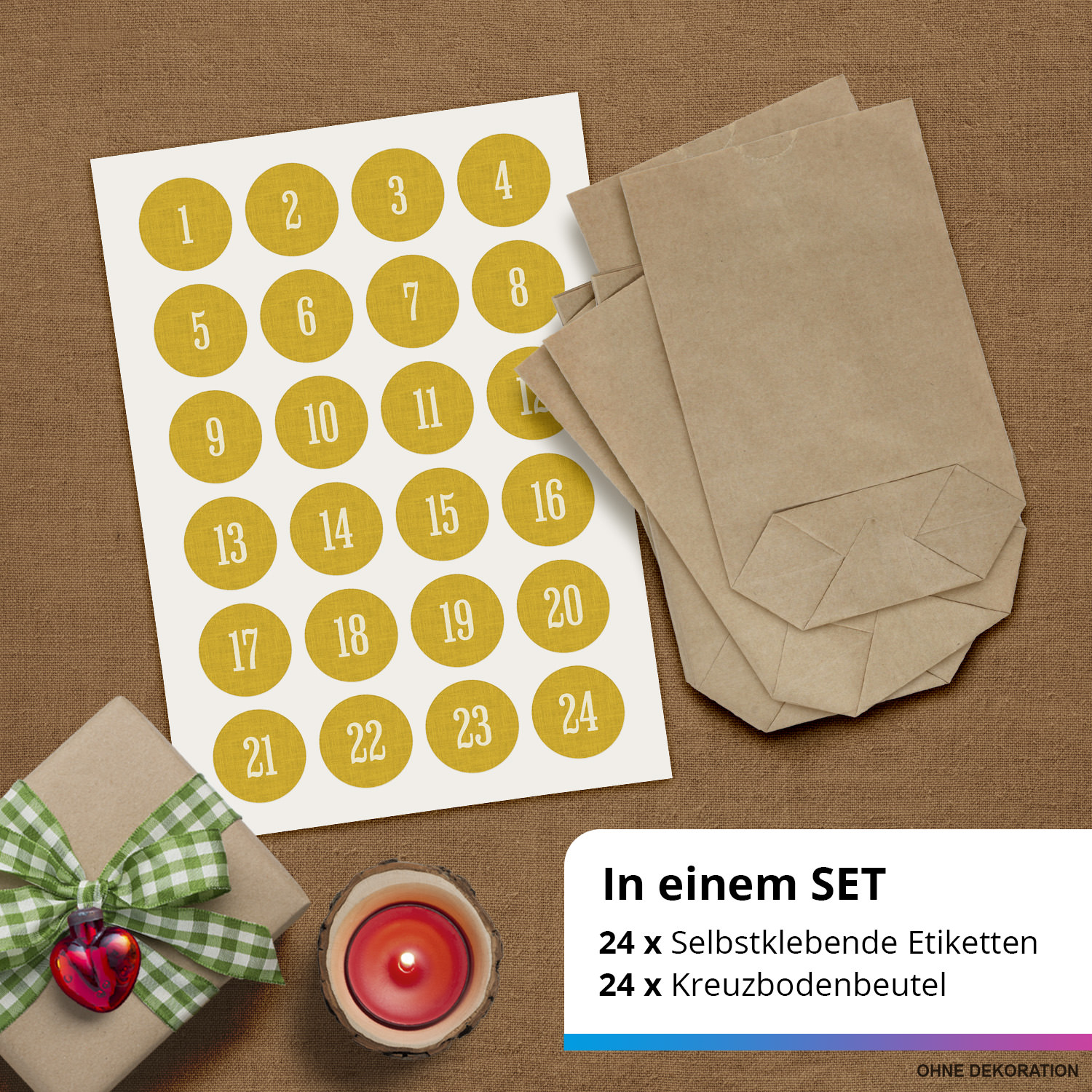 • Inhalt: 24 Zahlen Etiketten + 24 Kraftpapier Beutel