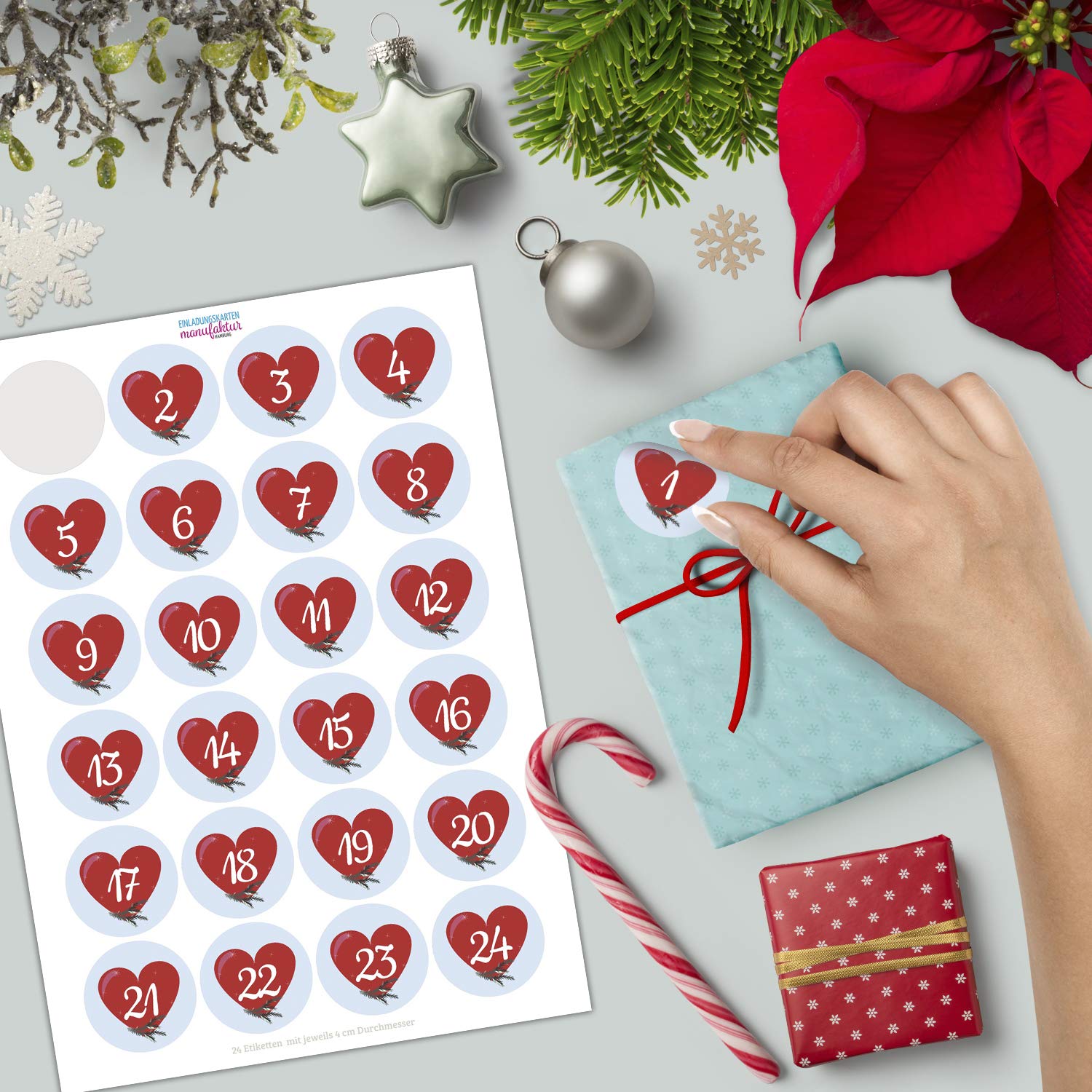 Adventskalender-Zahlen Aufkleber 1 bis 24 / Herz rot / Etiketten / Sticker / Weihnachtskalender / Advent / Rund / DIY / zum Aufkleben