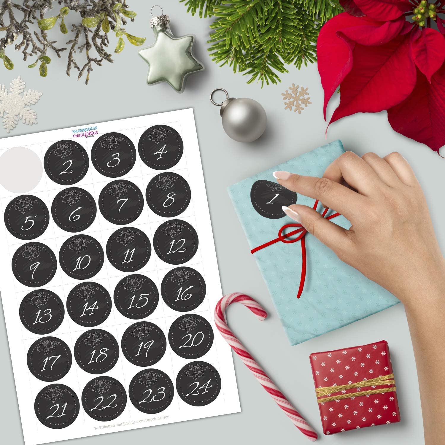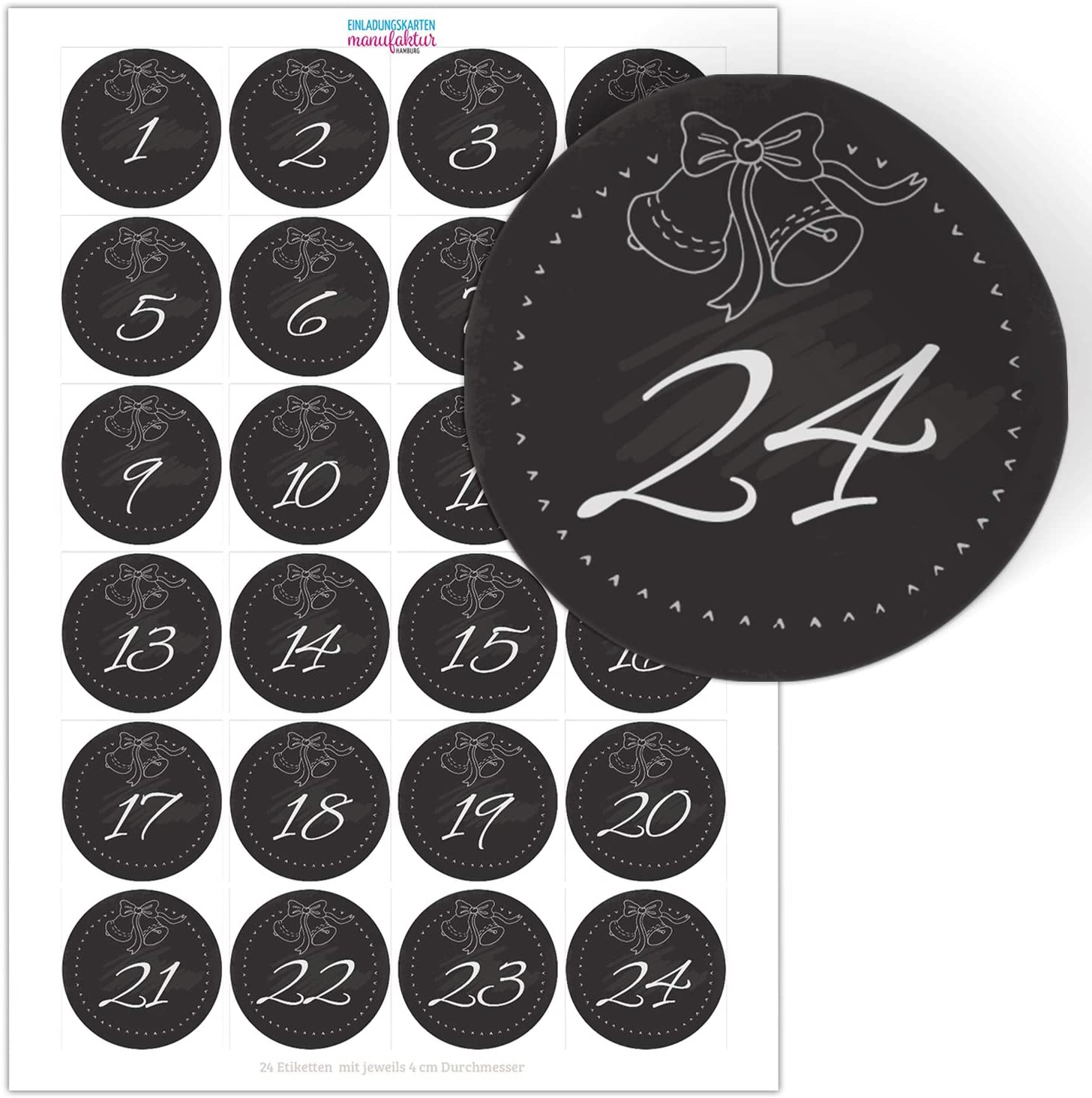 Adventskalender Zahlen Aufkleber – 24 runde Sticker (4 cm) mit den Zahlen 1 bis 24. Ideal zum Basteln von DIY-Adventskalendern, für Tüten, Schachteln, Umschläge & Geschenke.