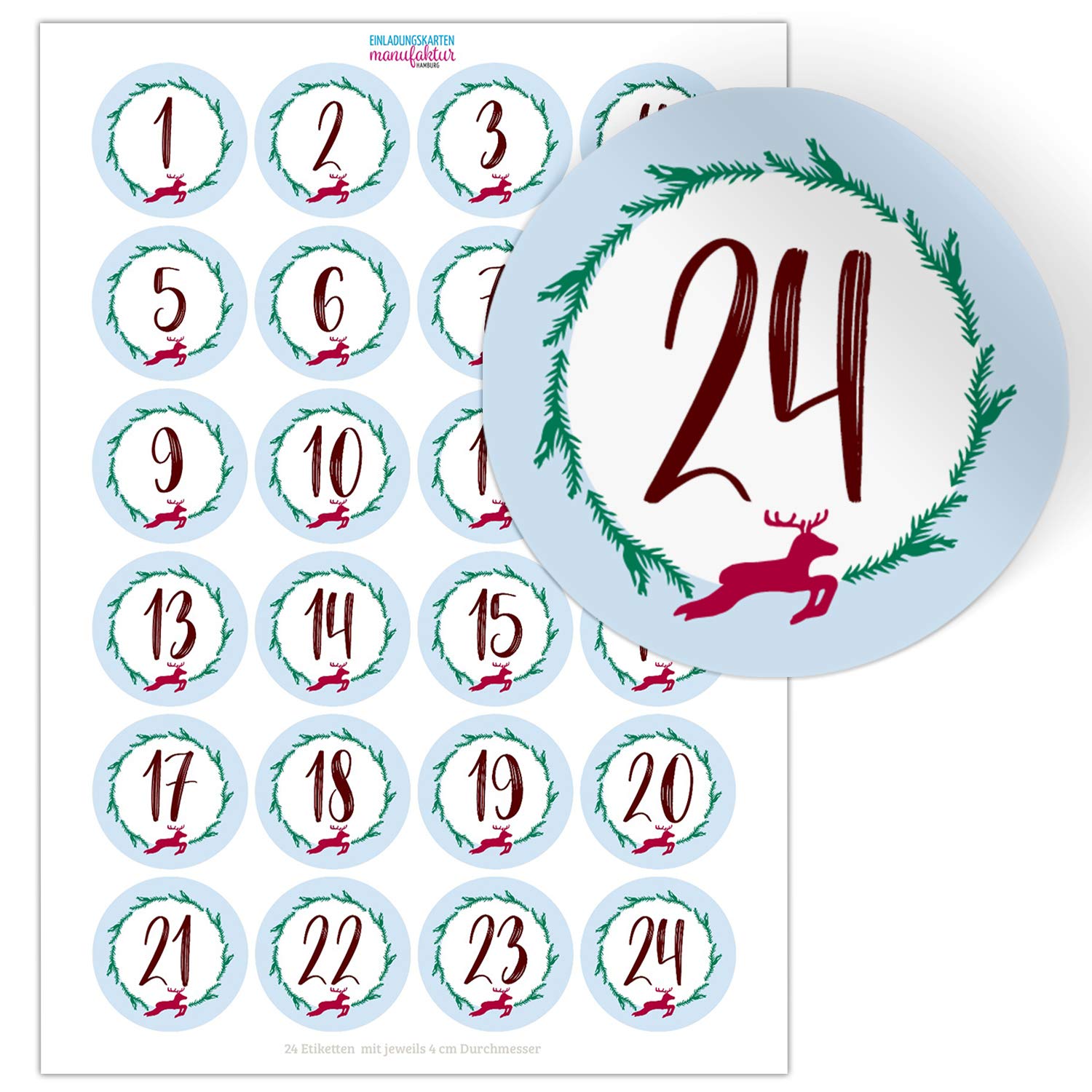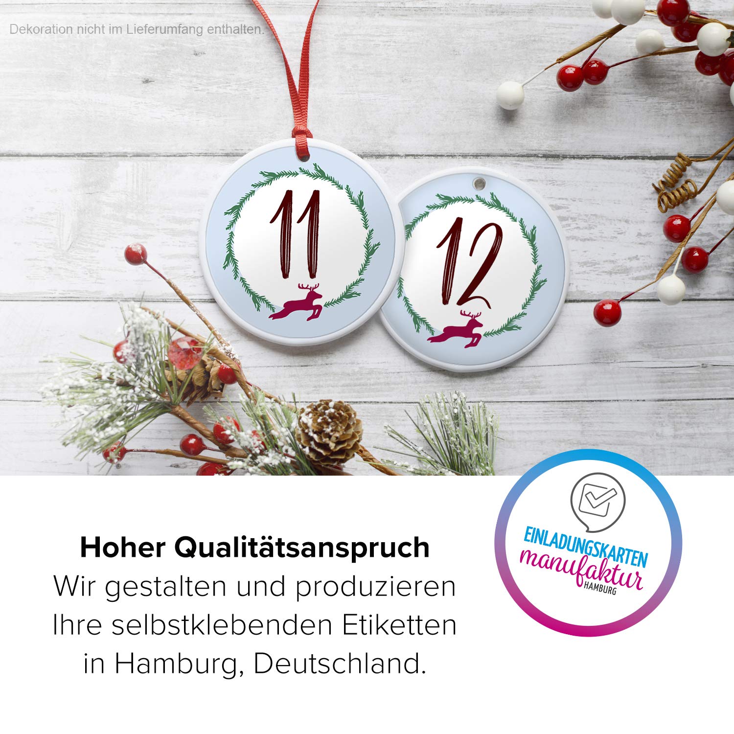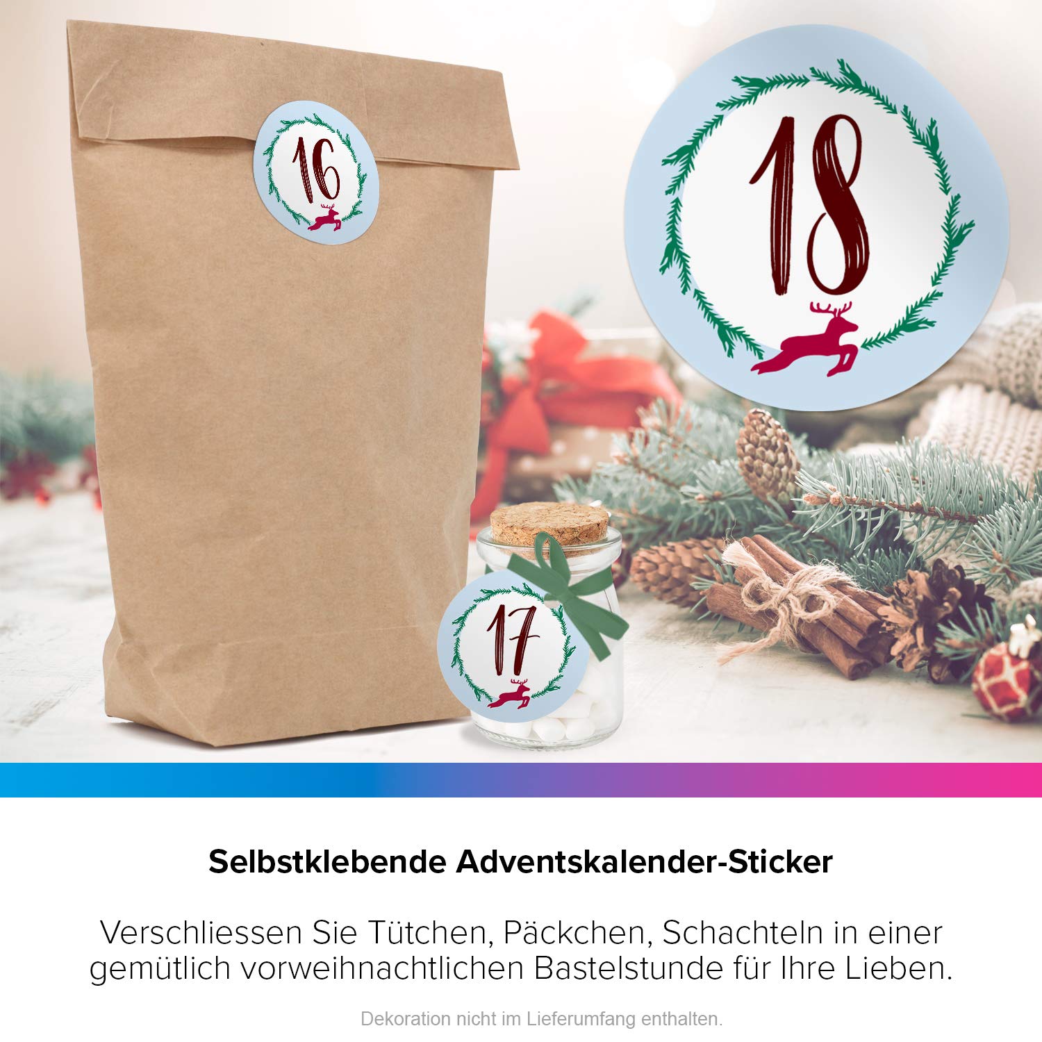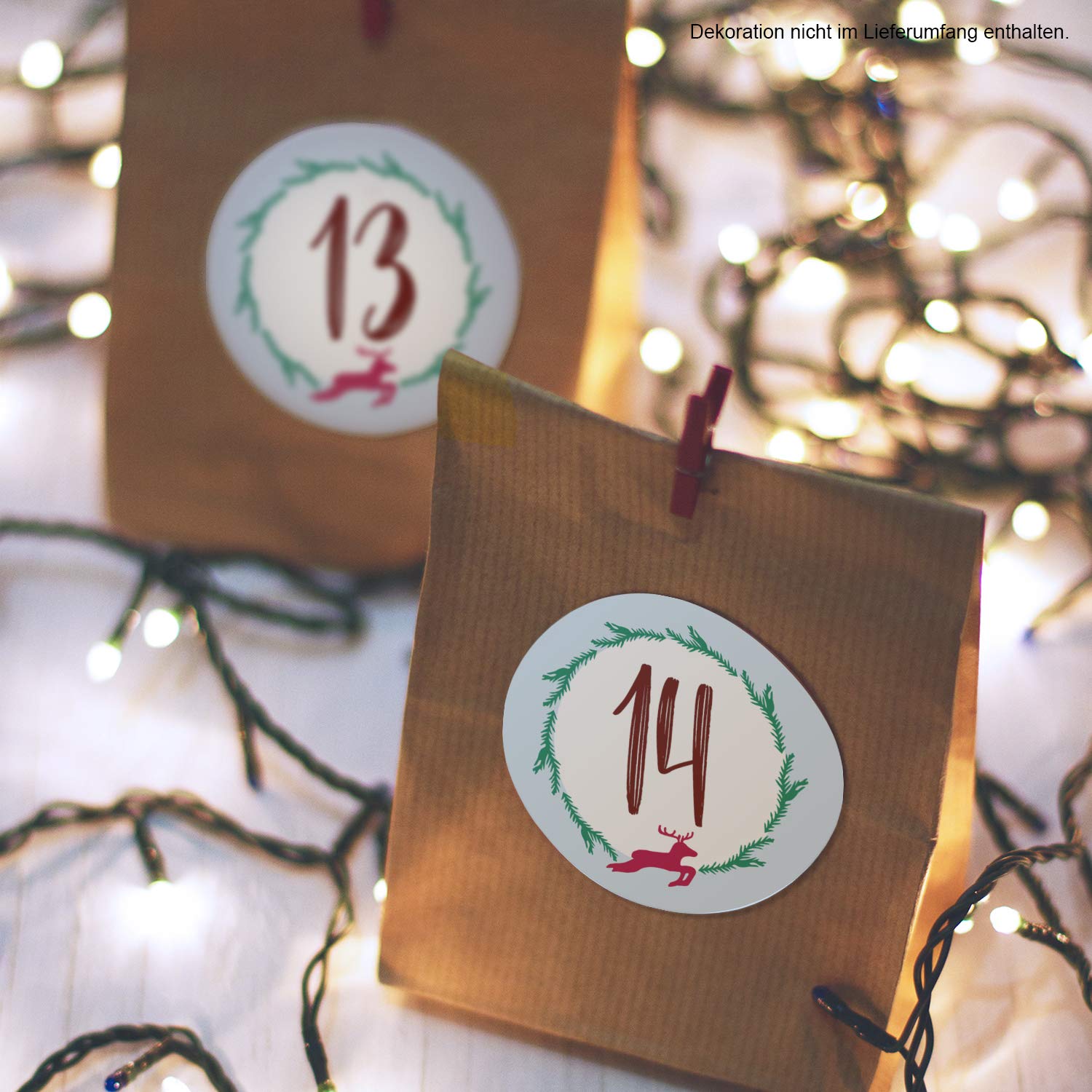 Adventskalender Zahlen Aufkleber – 24 runde Sticker (4 cm) mit den Zahlen 1 bis 24. Ideal zum Basteln von DIY-Adventskalendern, für Tüten, Schachteln, Umschläge & Geschenke.