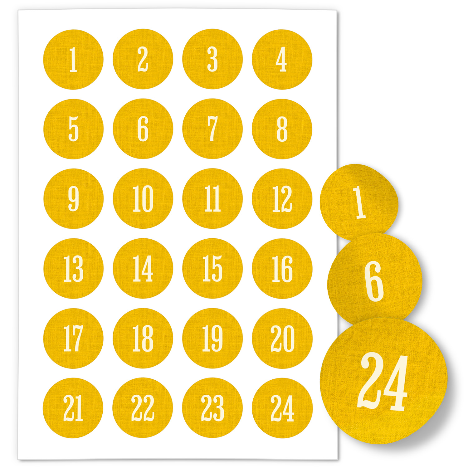 Adventskalender-Zahlen Aufkleber 1 bis 24 / Schlicht auf Gelb / Etiketten / Sticker / Weihnachtskalender / Advent / Rund / DIY / zum Aufkleben