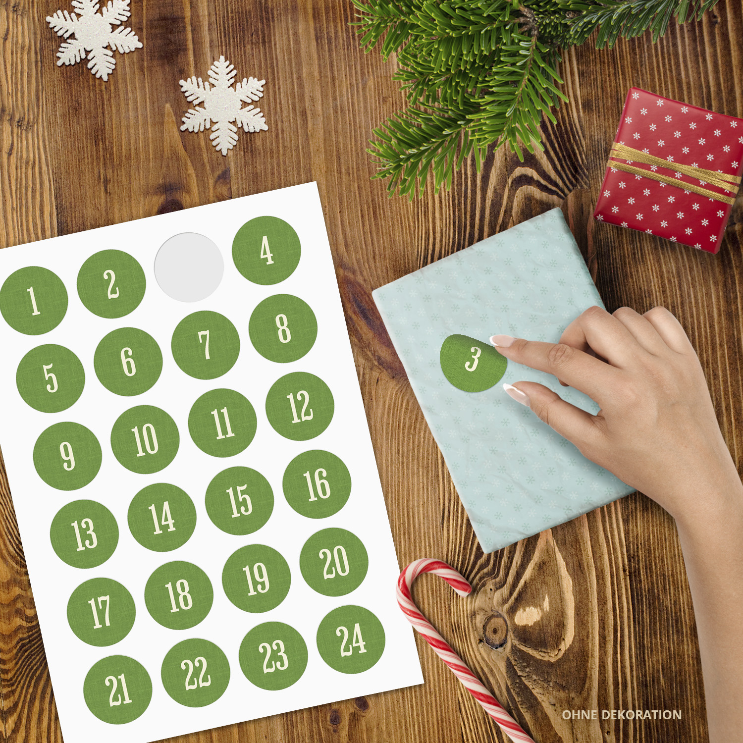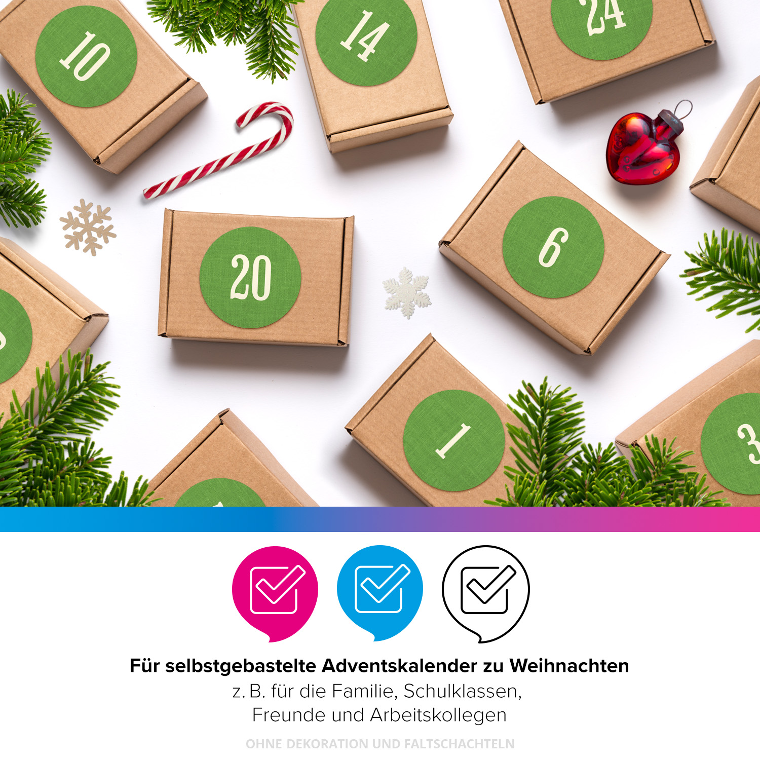 Adventskalender-Zahlen Aufkleber 1 bis 24 / Schlicht auf Grün / Etiketten / Sticker / Weihnachtskalender / Advent / Rund / DIY / zum Aufkleben