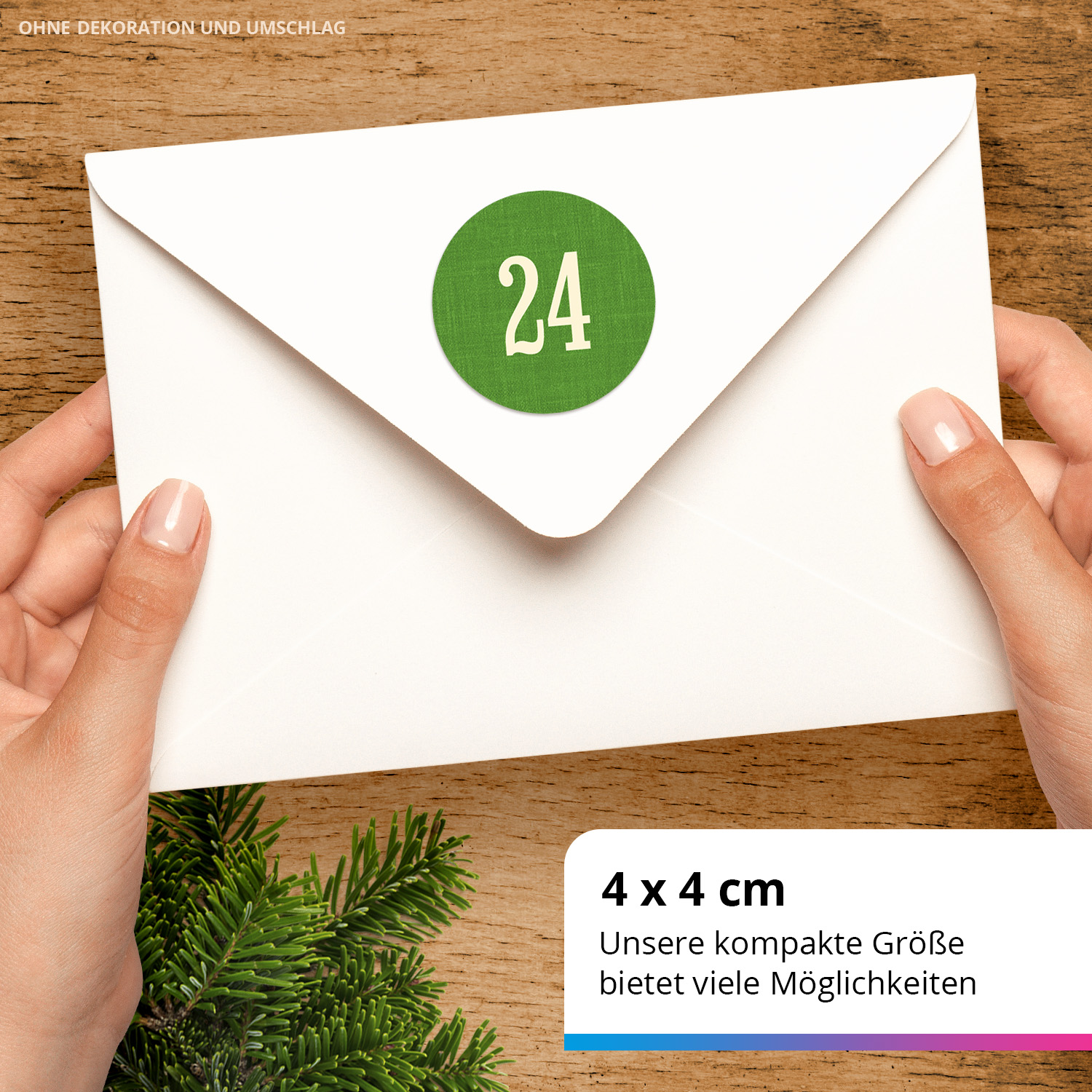 Adventskalender Zahlen Aufkleber – 24 runde Sticker (4 cm) mit den Zahlen 1 bis 24. Ideal zum Basteln von DIY-Adventskalendern, für Tüten, Schachteln, Umschläge & Geschenke.
