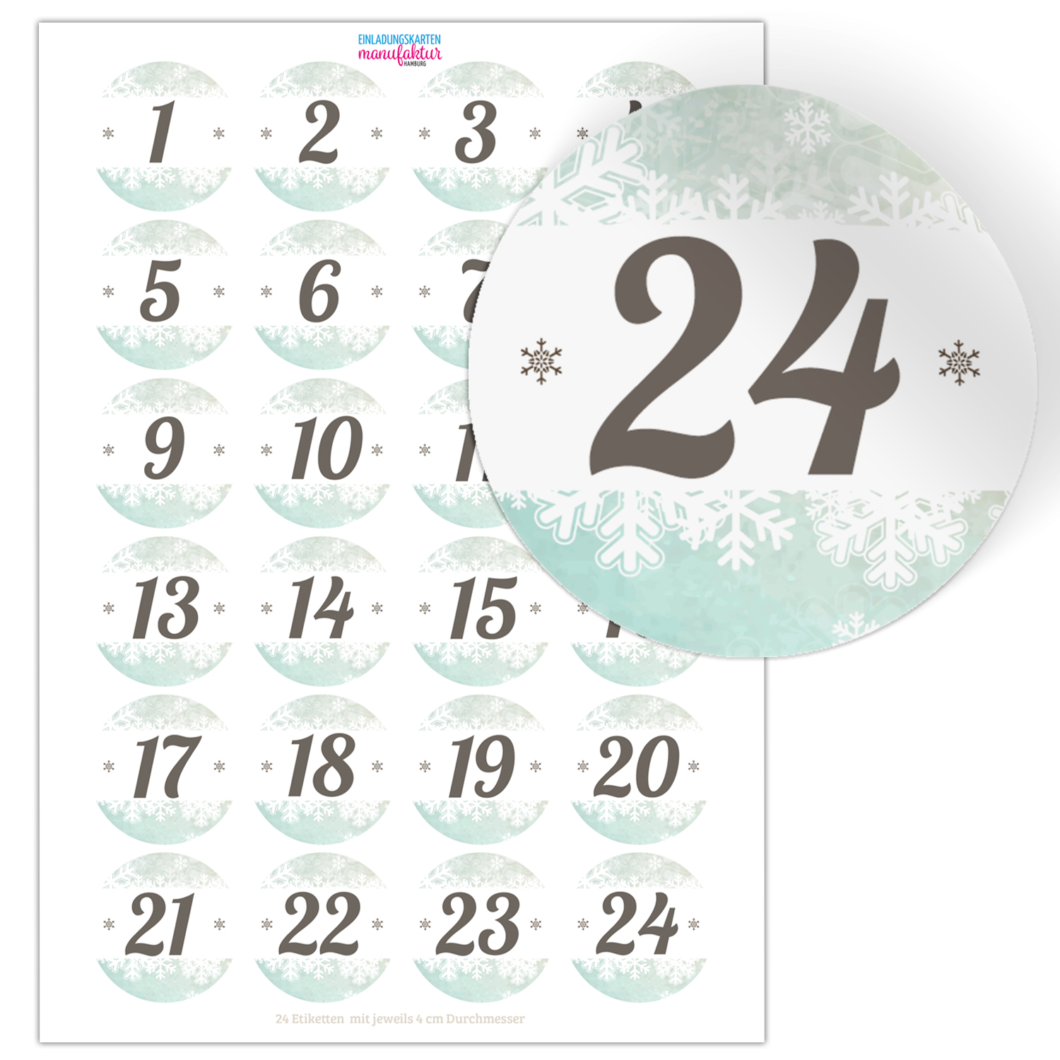 Adventskalender-Zahlen Aufkleber 1 bis 24 / Türkis modern, große Zahlen / Weihnachtskalender Etiketten rund / Advent / DIY / zum Aufkleben