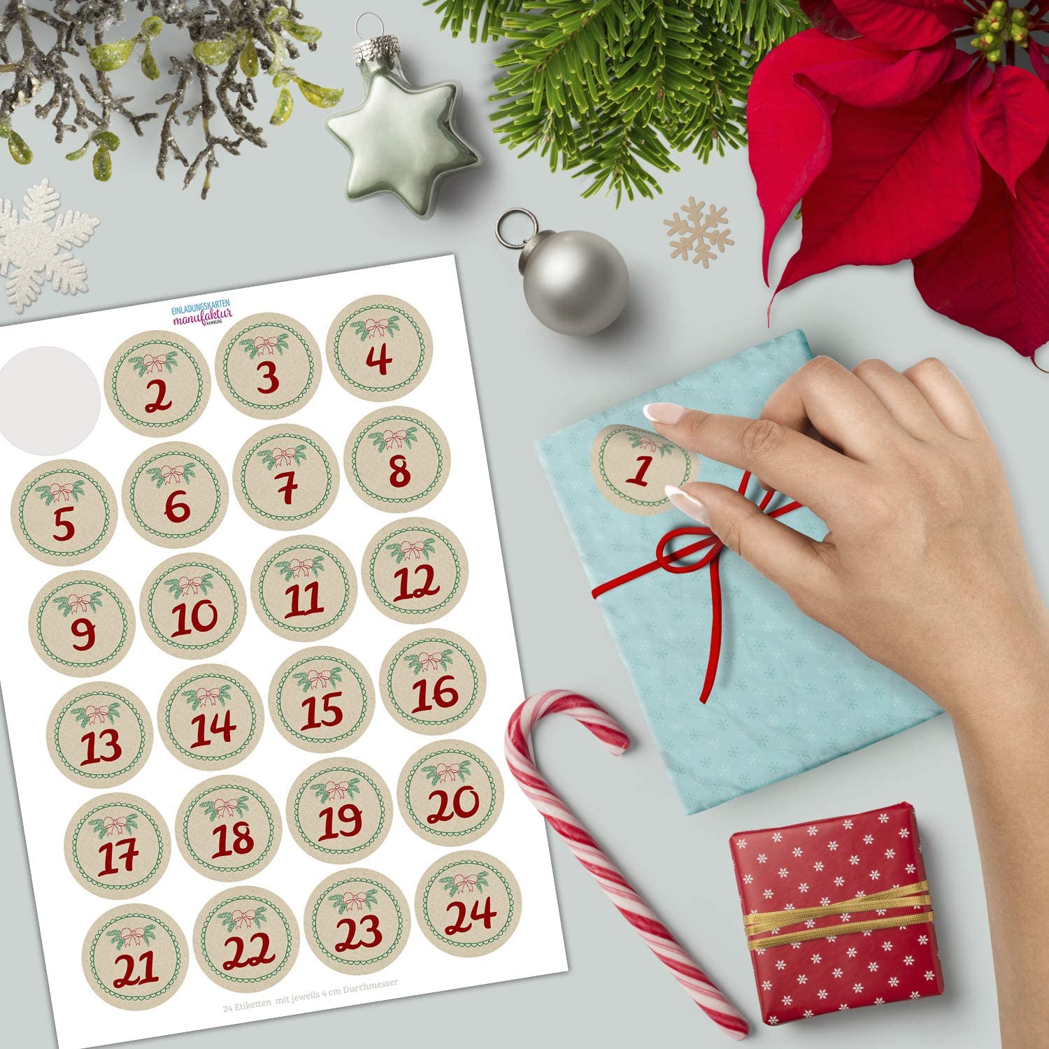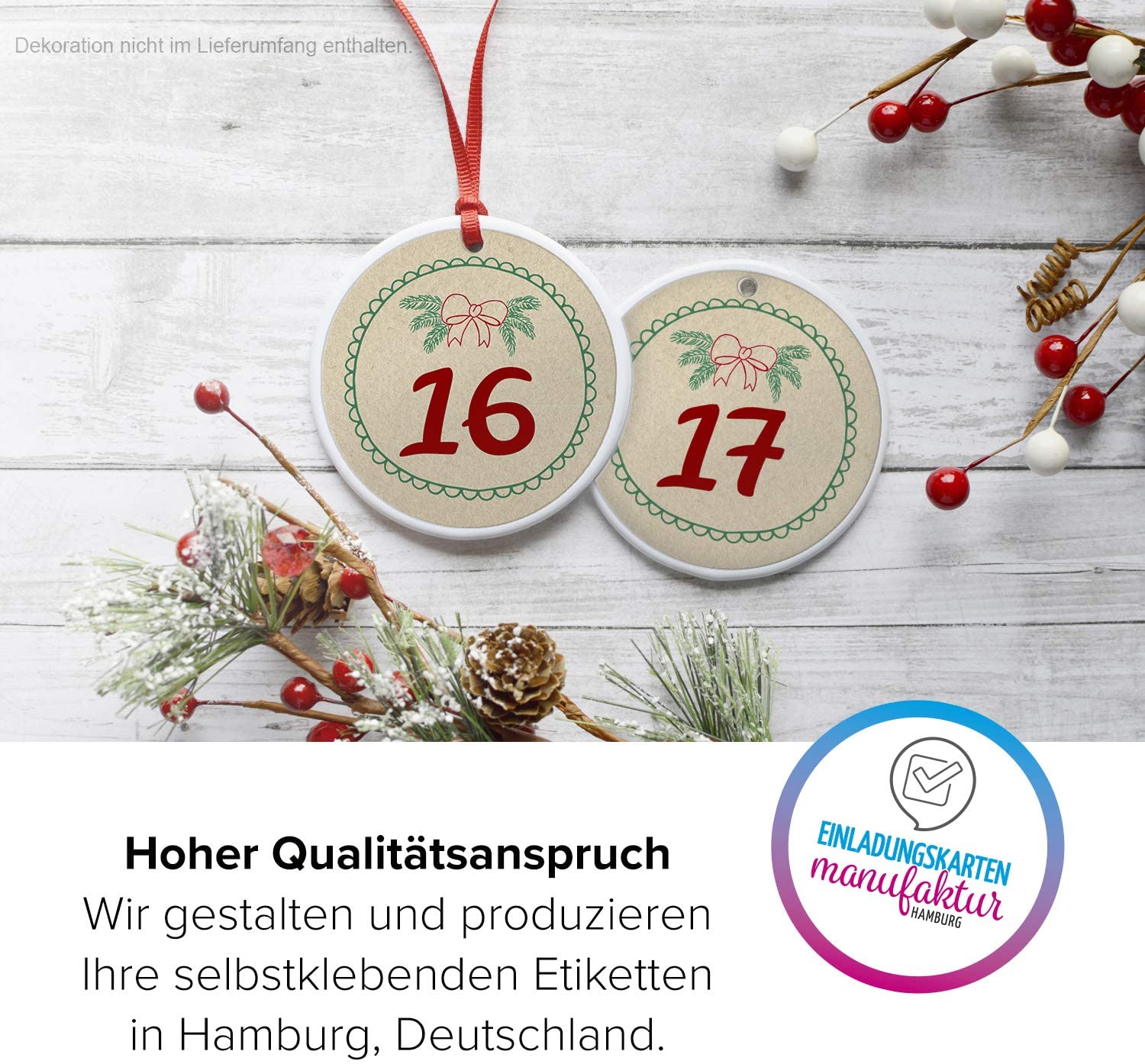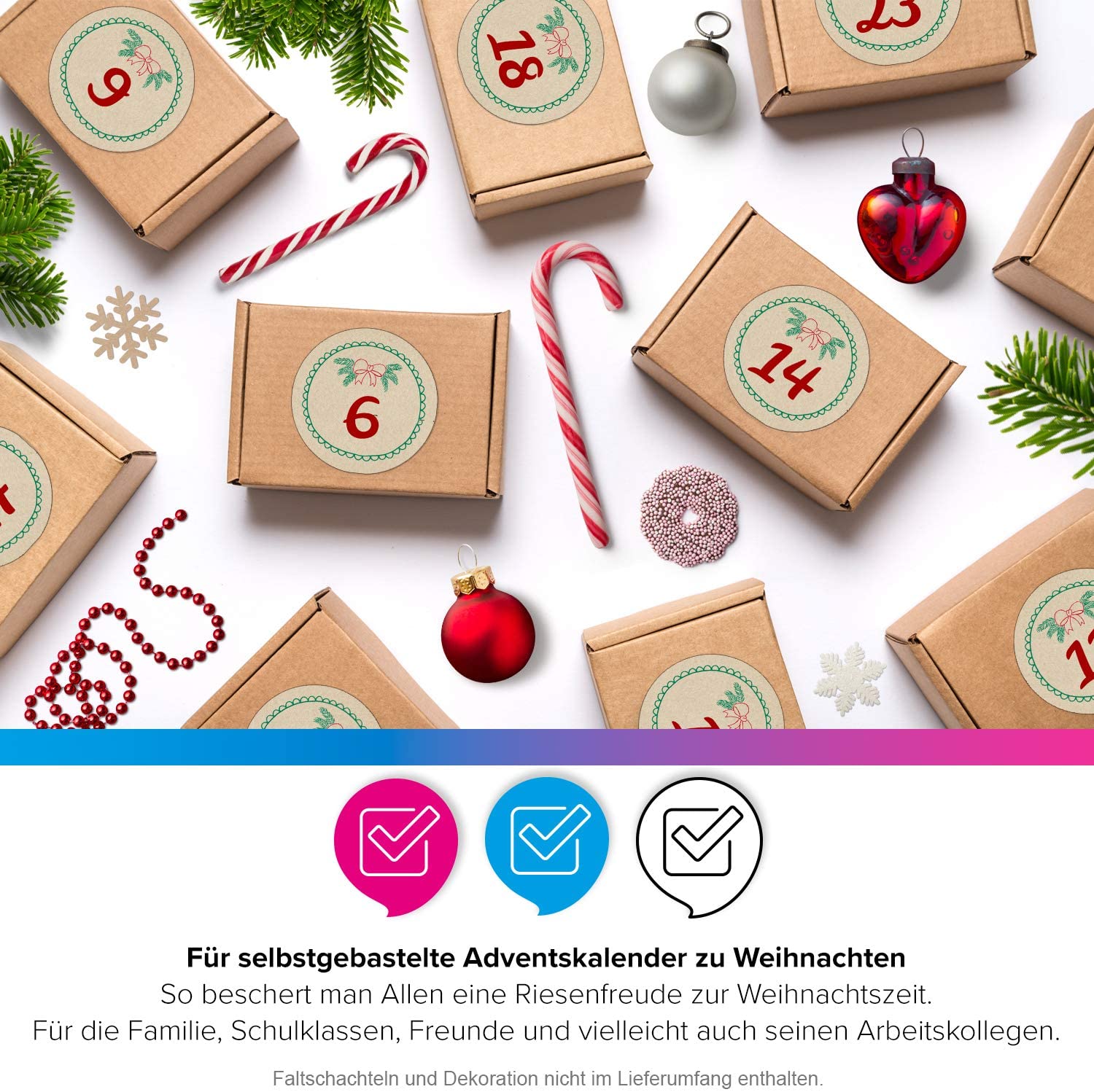 Adventskalender Zahlen Aufkleber – 24 runde Sticker (4 cm) mit den Zahlen 1 bis 24. Ideal zum Basteln von DIY-Adventskalendern, für Tüten, Schachteln, Umschläge & Geschenke.