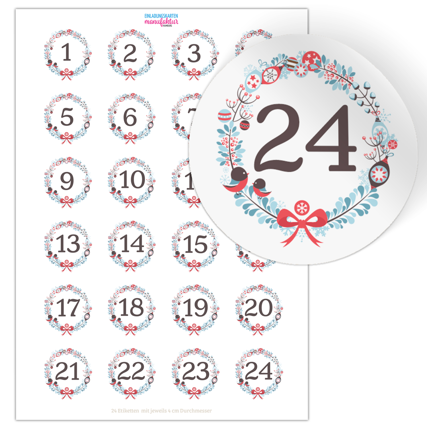 Adventskalender-Zahlen Aufkleber 1 bis 24 / Wunderbares Design, große Zahlen / Weihnachtskalender Etiketten rund / Advent / DIY / zum Aufkleben