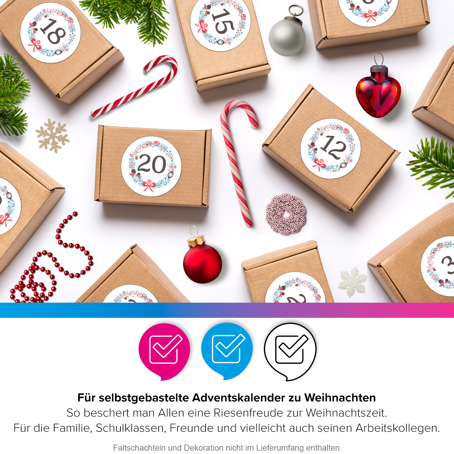 Adventskalender Zahlen Aufkleber – 24 runde Sticker (4 cm) mit den Zahlen 1 bis 24. Ideal zum Basteln von DIY-Adventskalendern, für Tüten, Schachteln, Umschläge & Geschenke.