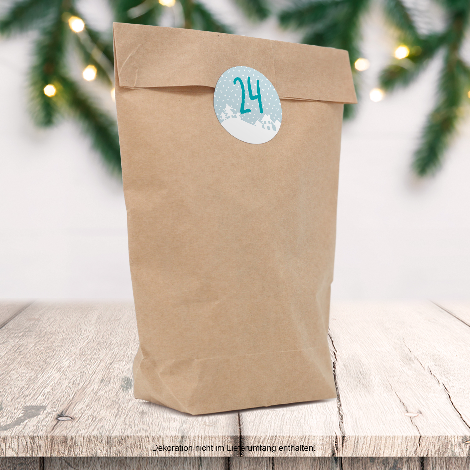 - Inhalt: 24 Zahlen Etiketten (1–24) + 24 Kraftpapier Beutel