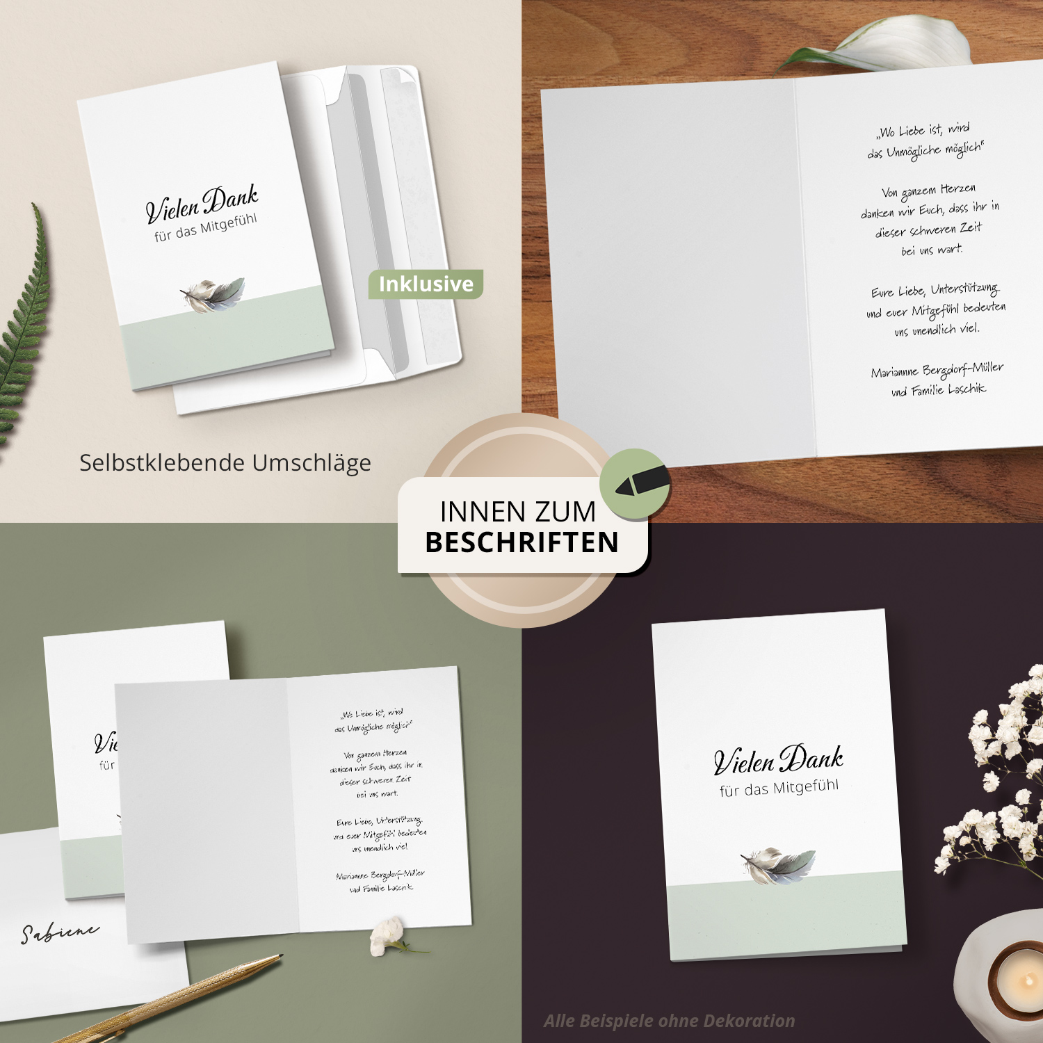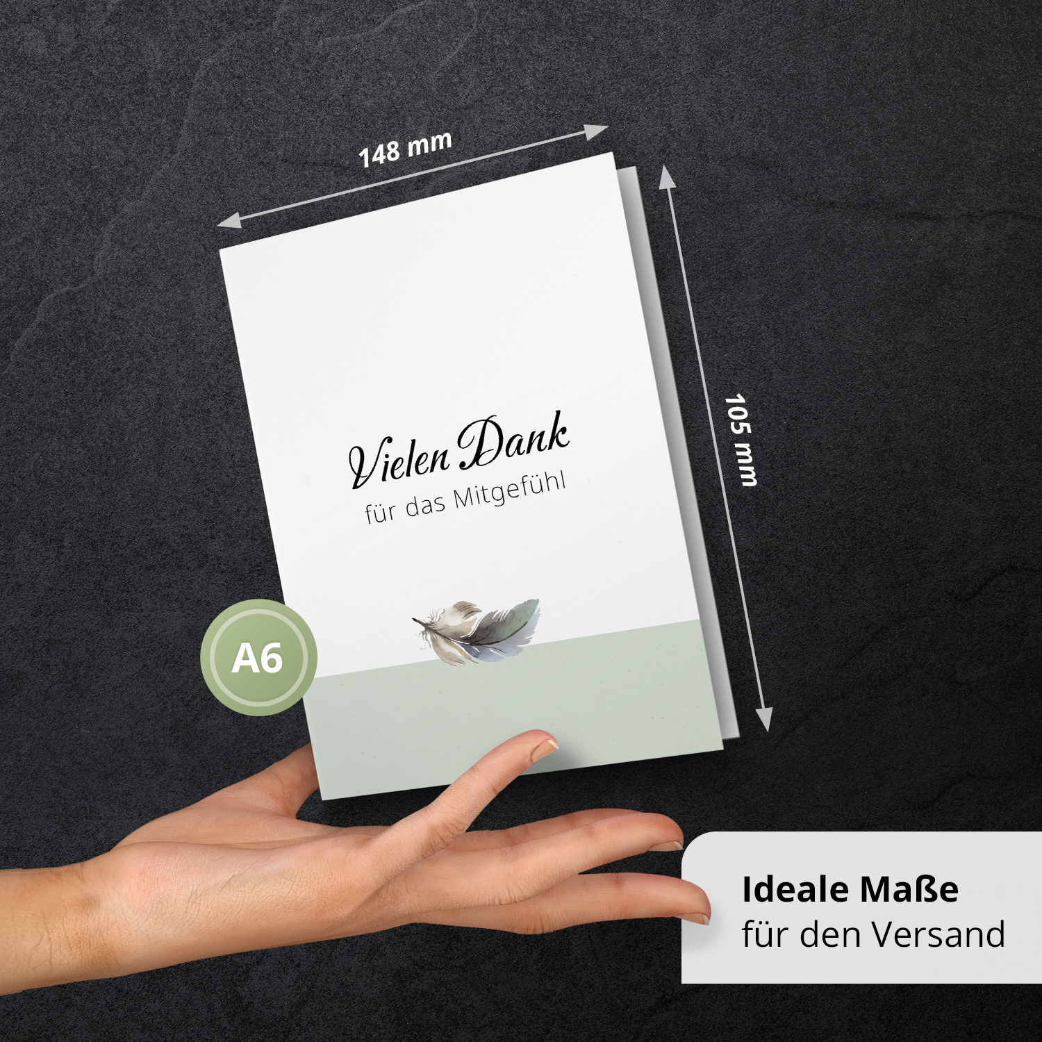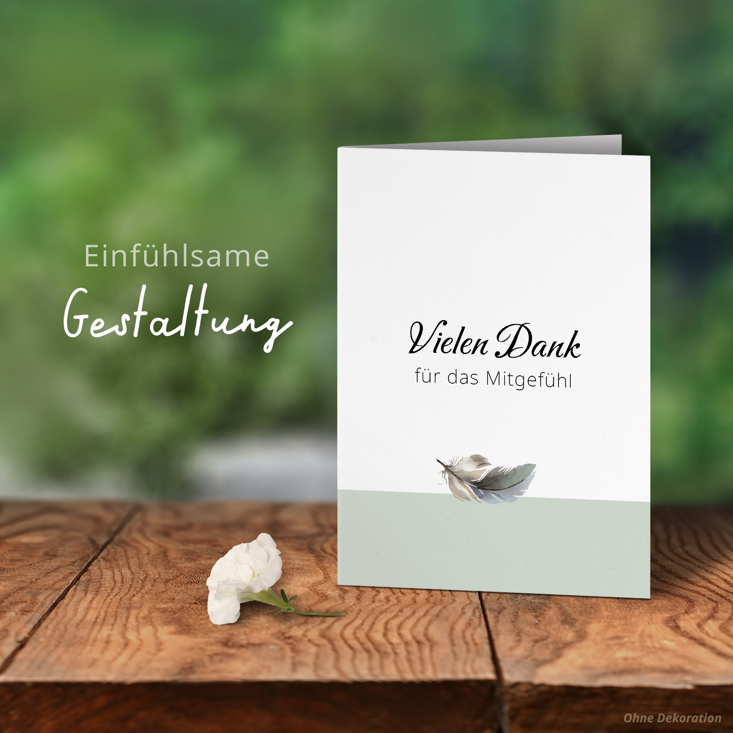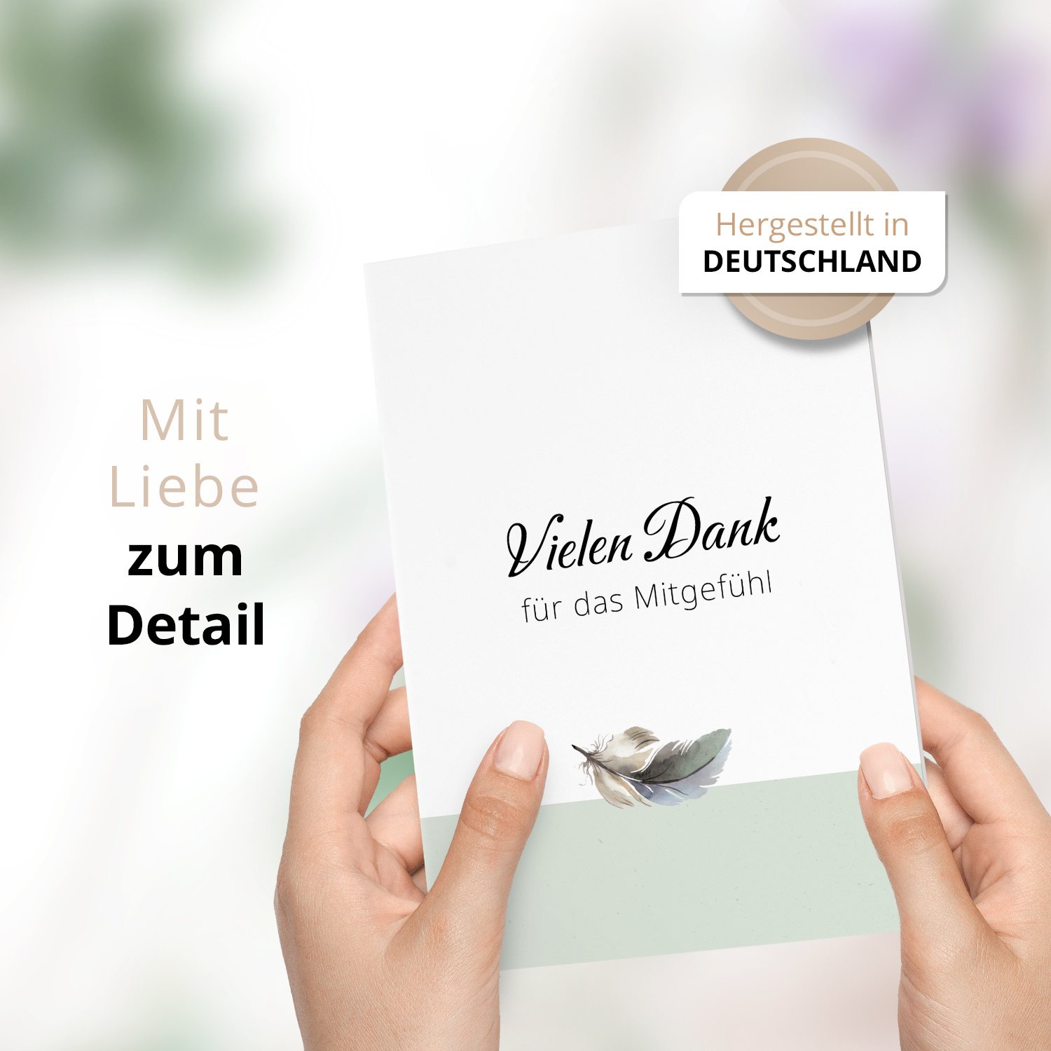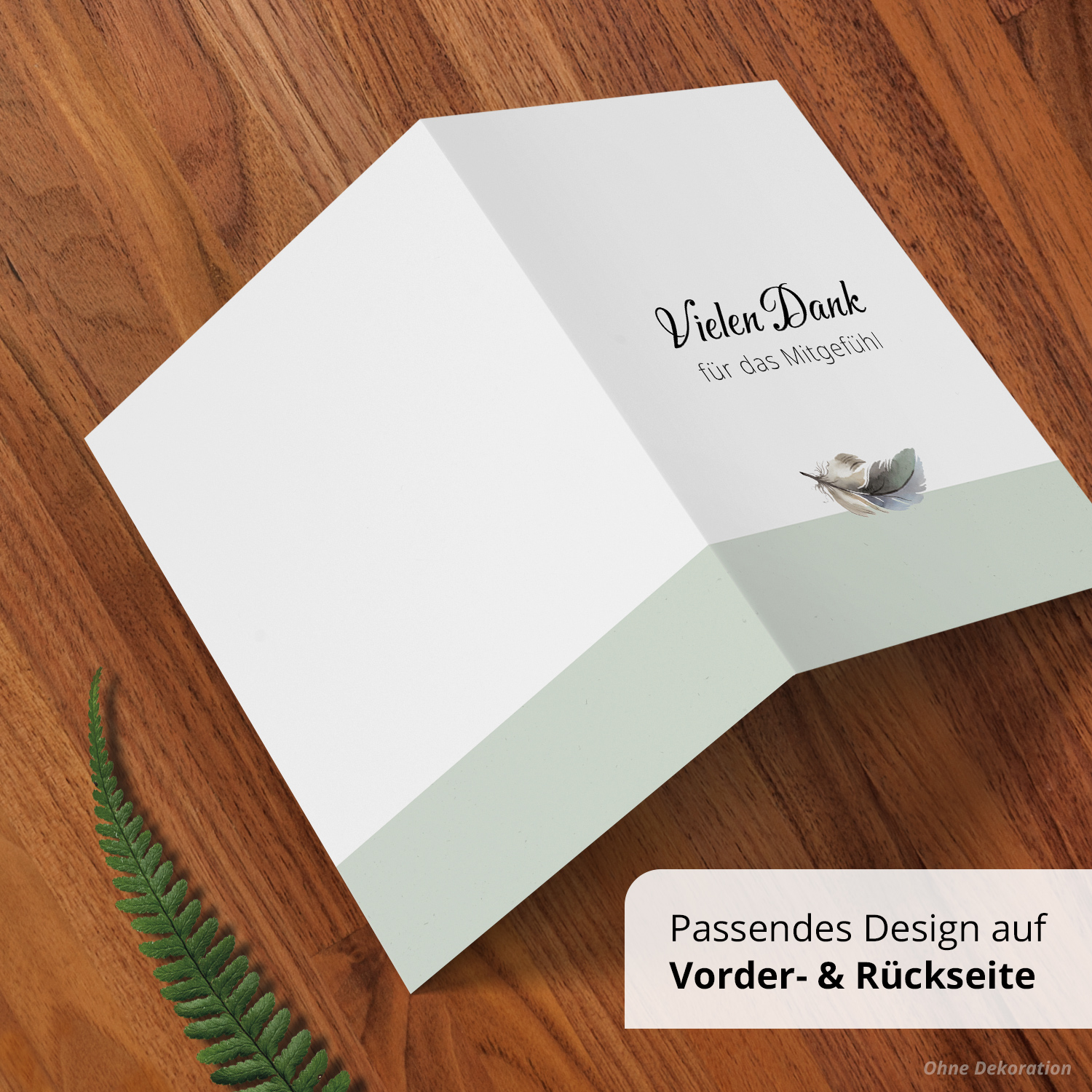 Danksagungskarten Trauer – 10 Stück mit Umschlägen – Motiv: Feder auf Mint – Trauerkarten Danksagung mit Text – Dankeskarten Trauer nach Beerdigung