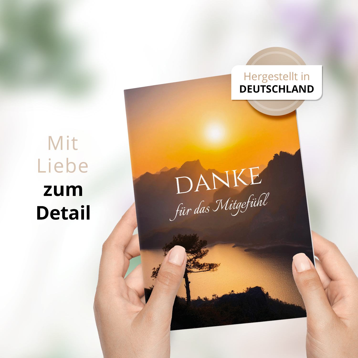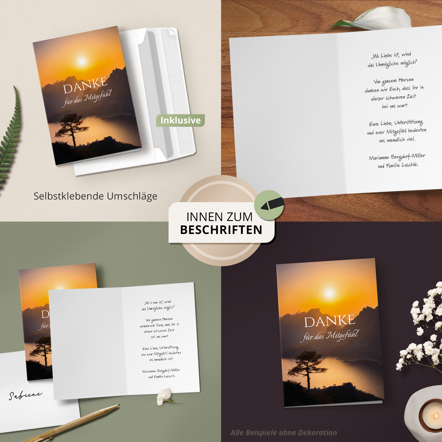 Danksagungskarten Trauer – 10 Stück mit Umschlägen – Motiv: Sonnenuntergang – Trauerkarten Danksagung mit Text – Dankeskarten Trauer nach Beerdigung