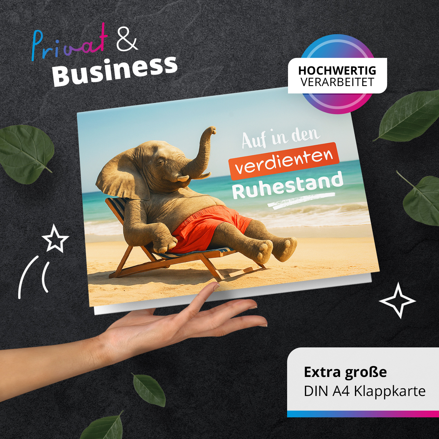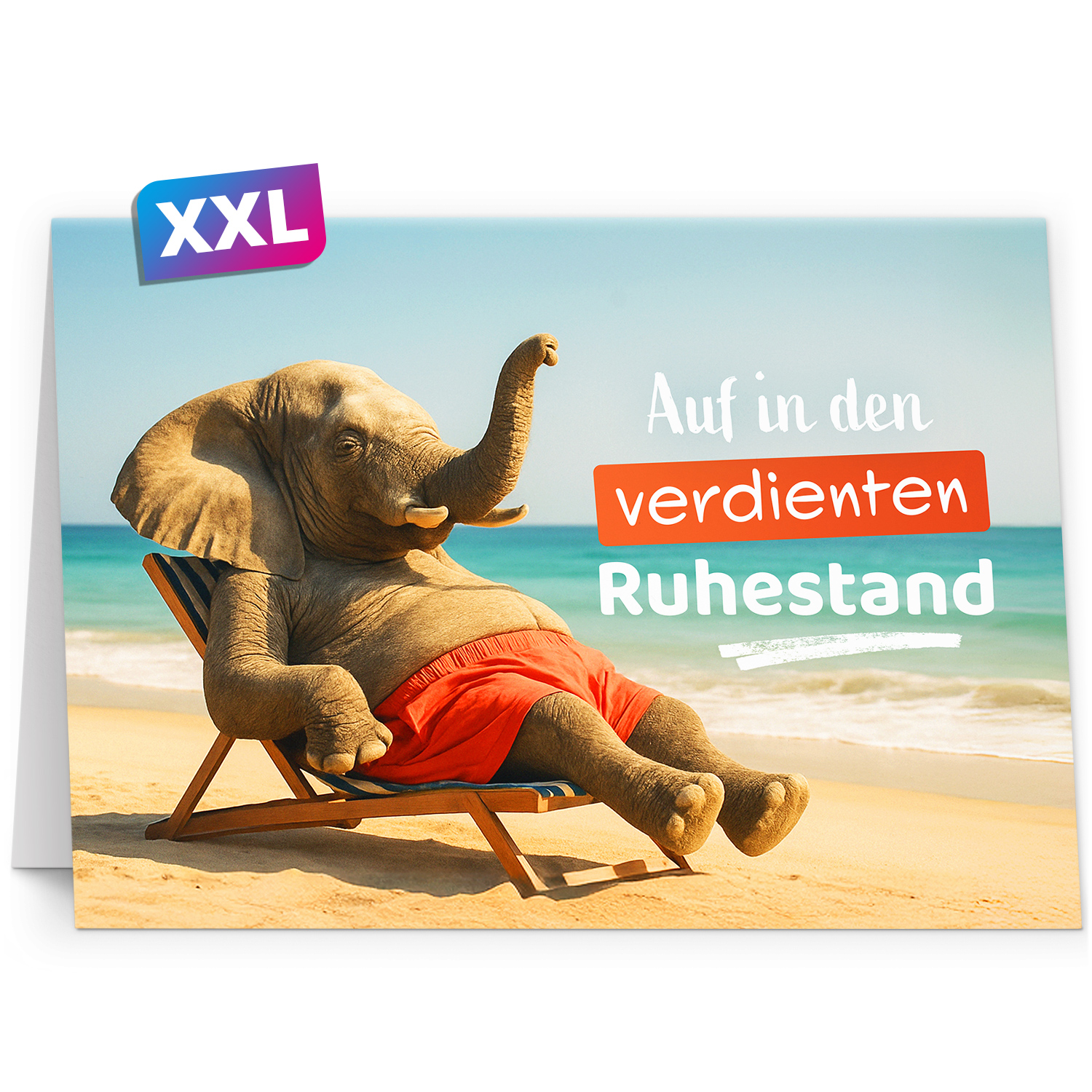 XXL Ruhestandskarte A4 mit Umschlag – Elefant am Strand – Abschiedskarte Pension Ruhestand – Premium Karte – Einladungskarten Manufaktur Hamburg
